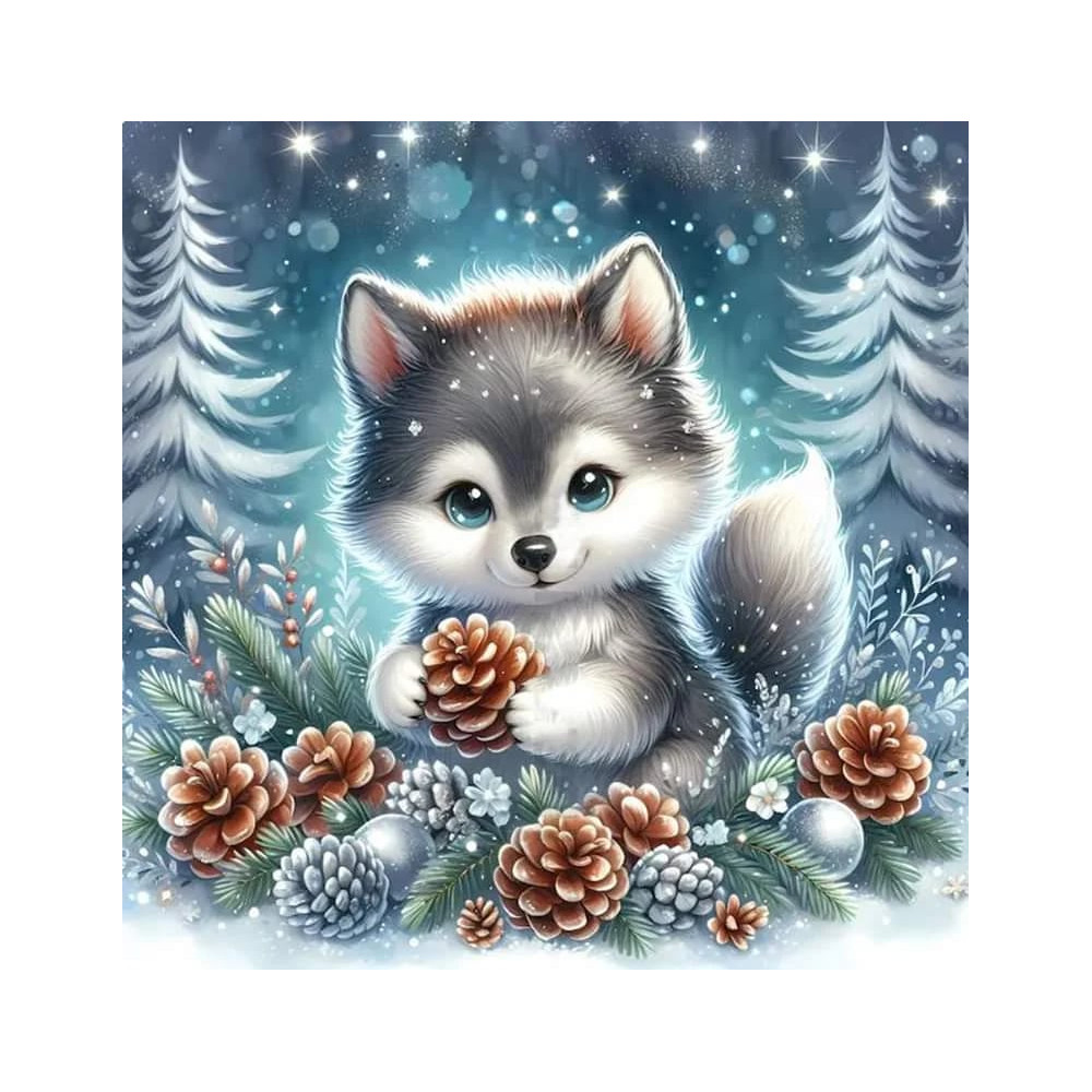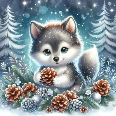 Vytvořte si pocit zimní radosti s tímto půvabným diamantovým malováním. Zářivě modré oči štěněte se dívají vzhůru z hromady šišek a jehličí, zatímco jemné sněhové vločky tančí okolo něj, vytvářející obraz dokonalé zimní idyly. Každý diamant, použitý v tomto obrazu, je pečlivě vybrán, aby přesně zapadl do této scény plné mrazivé elegance a nevinné hravosti.