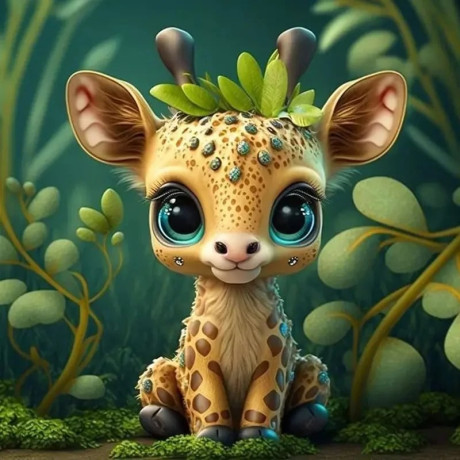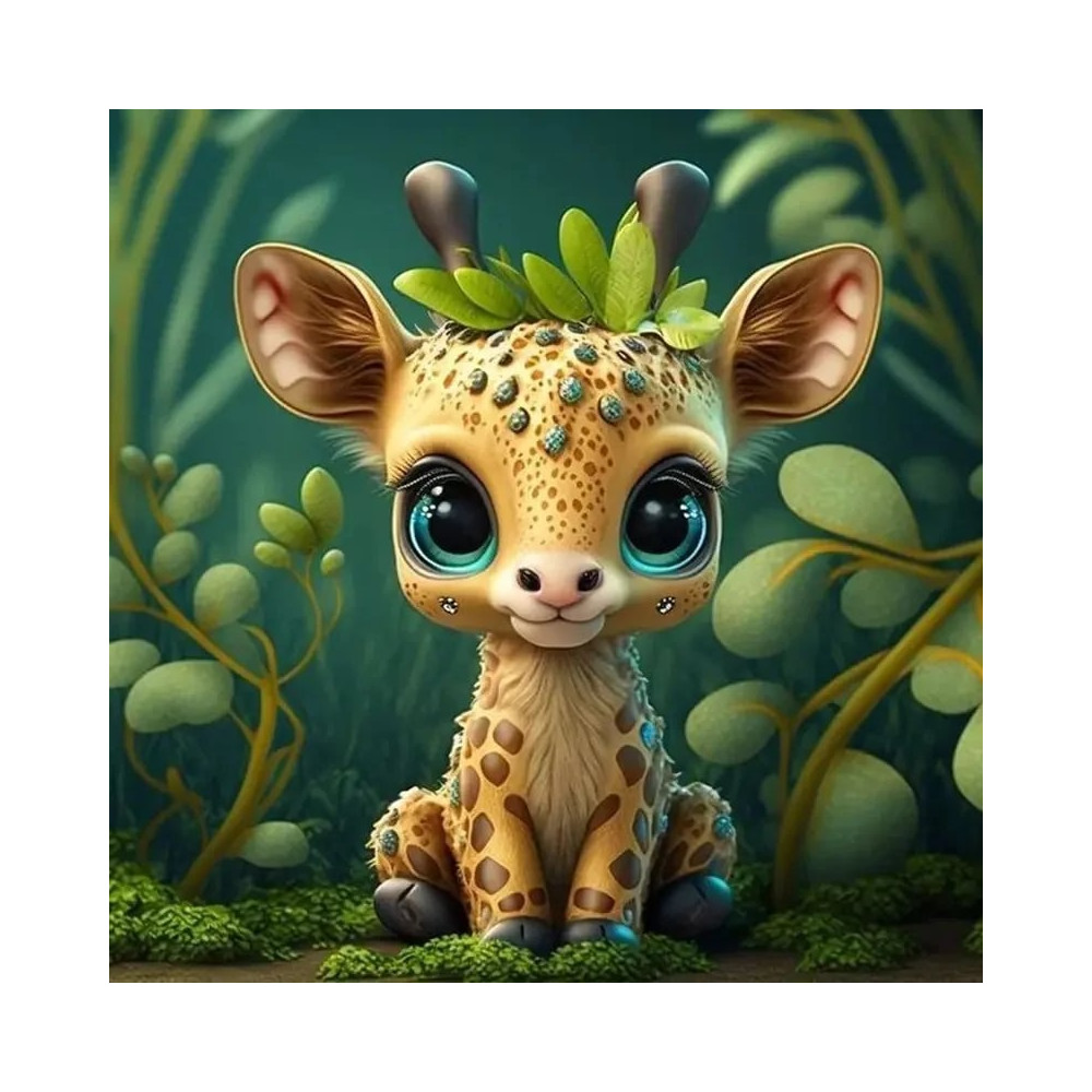 Zapojte svou rodinu do světa fantazie s tímto okouzlujícím diamantovým malováním. Mladé žirafí štěně s nesmírně velkými očima sedí obklopeno lesklými listy a hřejivou atmosférou lesa, jehož každý detail je vylepšen třpytivými diamanty.