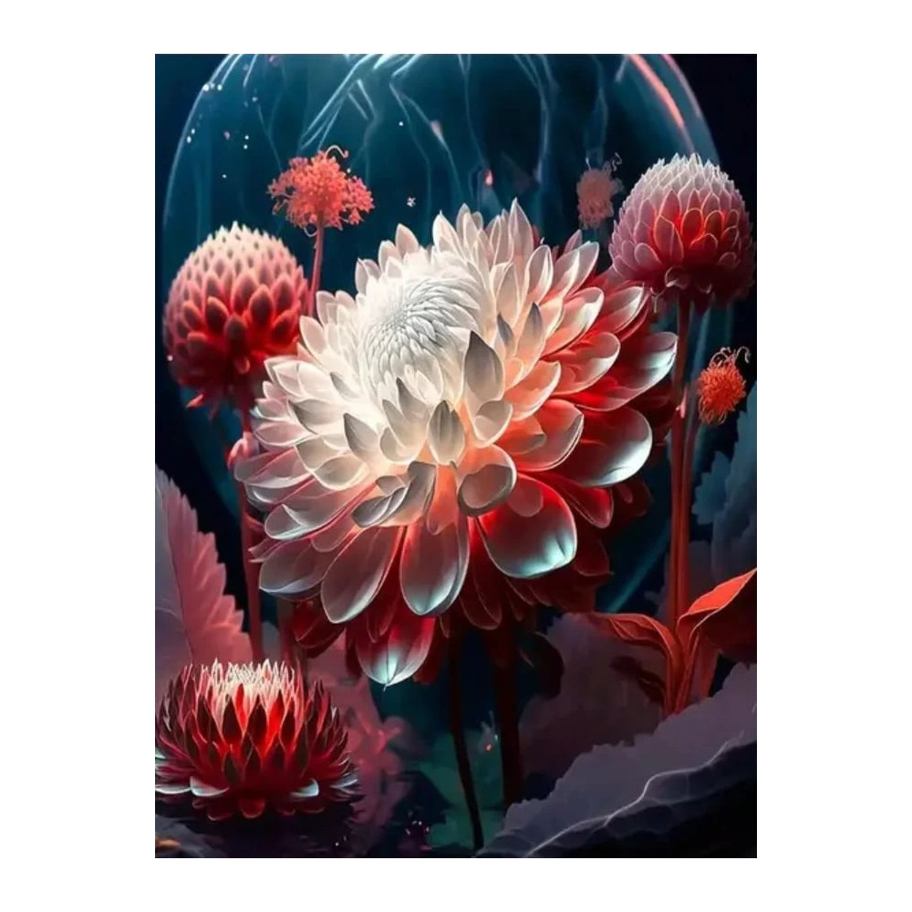 Tato sada diamantového malování je poctou kráse květin a jejich neopakovatelnému kouzlu. Každý květ na plátně je vyveden s láskou a přesností, od sytě červených tónů po jemné náznaky růžové a bílé, obklopené zvýrazněným temným pozadím, které přidává hloubku a kontrast.