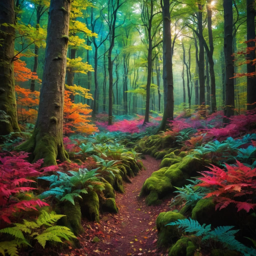 Toto diamantové malování otevírá pohled na lesní cestu, která se vine skrz podmanivou krajinu, jež žije v kaleidoskopu barev a textur. Sluneční paprsky se probíjejí skrz větve stromů a osvětlují zemi, obalené jemným sametem mechů a rozkvetlých kapradin. Odstíny rudých, fialových a oranžových květů rozehrávají symfonii barev a dodávají hloubku a komplexnost celé scéně.