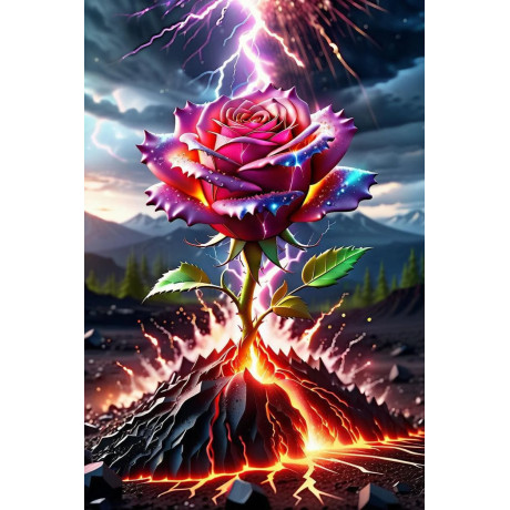 Toto diamantové malování "Růže síly" je mistrovským dílem, které zachycuje ohnivou energii a vesmírnou nádheru v jednom. Představte si růži, která se zrodila z lávy sopky, obklopenou energií vesmíru a blesky, jež dotvářejí tuto scénu nesmírné síly.