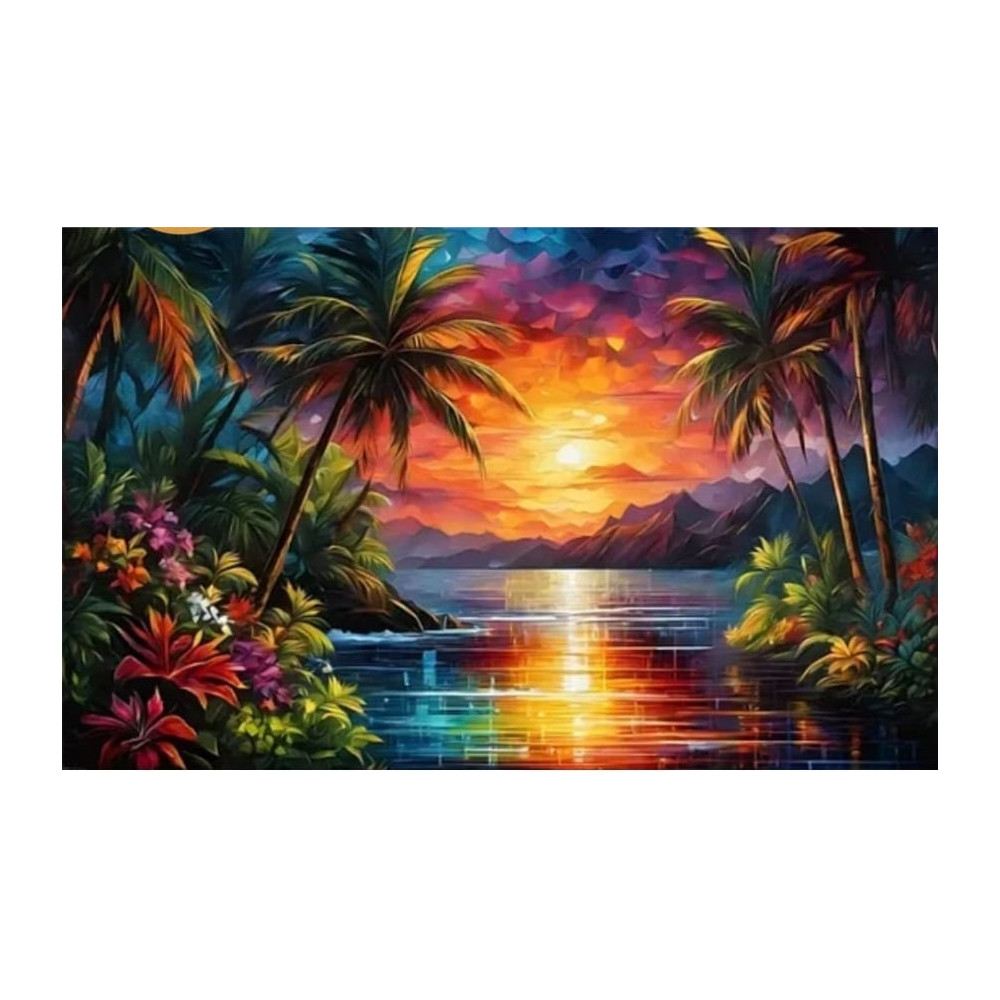 Diamantové malování tropického západu slunce zachycuje nádheru přírody s bohatými barvami a detailními záběry palem a květin. Tento dekorativní obraz přináší do vašeho domova atmosféru klidu a exotiky, ideální pro oživení jakéhokoli prostoru.