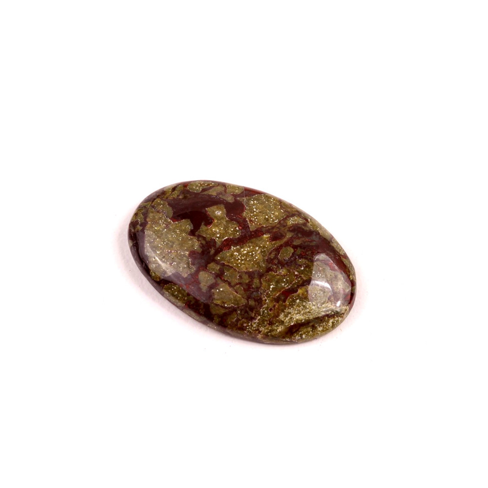 Kabošon z přírodního kamene Dragon Blood Jasper (jaspis dračí krve) vyniká svými jedinečnými odstíny tmavě zelené a rudé, které působí dojmem mystické a tajemné energie. Tento vzácný kámen je ceněný pro svůj neobvyklý vzhled, který připomíná krev draka, a je ideální pro šperky, které mají vyzařovat sílu, odvahu a spojení s přírodou. Dragon Blood Jasper je známý jako kámen vitality a síly, který podporuje odvahu a odhodlanost.