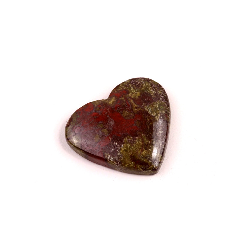 Kabošon z přírodního kamene Dragon Blood Jasper (jaspis dračí krve) vyniká svými jedinečnými odstíny tmavě zelené a rudé, které působí dojmem mystické a tajemné energie. Tento vzácný kámen je ceněný pro svůj neobvyklý vzhled, který připomíná krev draka, a je ideální pro šperky, které mají vyzařovat sílu, odvahu a spojení s přírodou. Dragon Blood Jasper je známý jako kámen vitality a síly, který podporuje odvahu a odhodlanost.