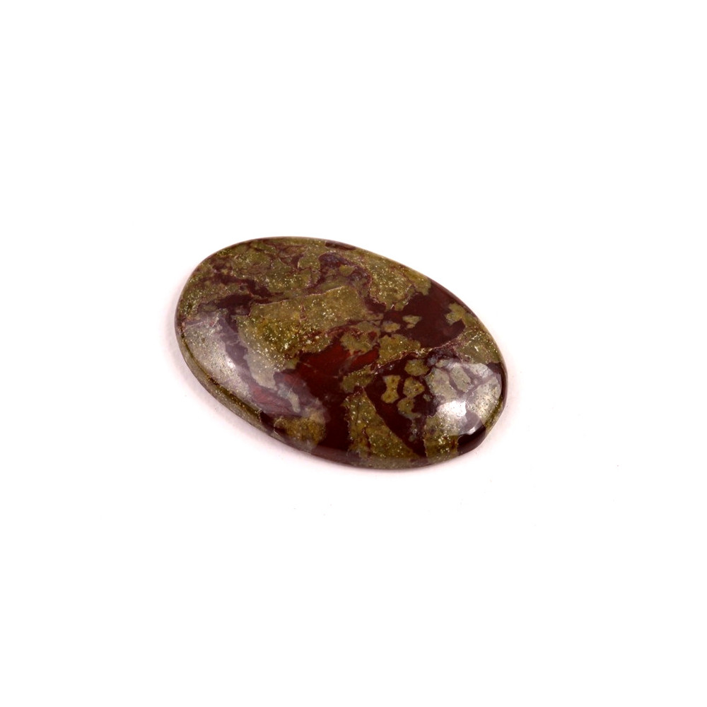 Kabošon z přírodního kamene Dragon Blood Jasper (jaspis dračí krve) vyniká svými jedinečnými odstíny tmavě zelené a rudé, které působí dojmem mystické a tajemné energie. Tento vzácný kámen je ceněný pro svůj neobvyklý vzhled, který připomíná krev draka, a je ideální pro šperky, které mají vyzařovat sílu, odvahu a spojení s přírodou. Dragon Blood Jasper je známý jako kámen vitality a síly, který podporuje odvahu a odhodlanost.