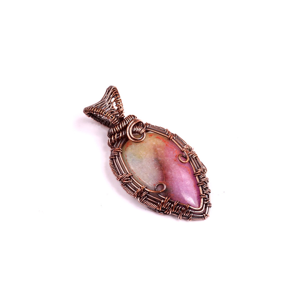 Tento unikátní přívěsek je vyroben z minerálu solar quartz, který vyniká svou krásnou barevnou paletou jemných růžových, fialových a zelených tónů, zachycených v přirozené struktuře krystalu. Kámen je obklopen složitou technikou obdrátkování pomocí měděného drátku, který zdůrazňuje jeho přirozenou krásu a zároveň dodává šperku rustikální a elegantní vzhled.