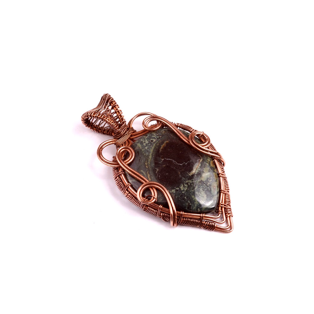 Tento elegantní přívěsek z minerálu Green Jade (zelený jadeit) je mistrovsky obplétán měděným drátkem, který dokonale doplňuje hluboké, zelené tóny kamene. Zelený jadeit je známý jako kámen klidu, moudrosti a harmonie. Jeho tmavé a tajemné odstíny vytvářejí příjemný kontrast s teplým odstínem měděného drátku, který je obtočen kolem kamene v ozdobných spirálách a křivkách.