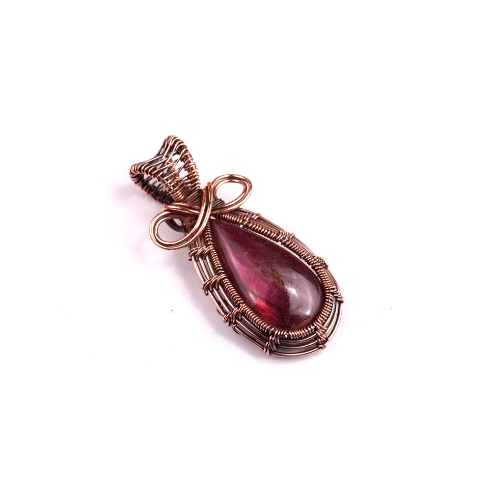 Tento přívěsek z minerálu Purple Labradorite je ručně obplétán měděným drátkem, který dokonale zvýrazňuje jeho okouzlující fialové odlesky a unikátní strukturu. Purple labradorit je známý pro svůj zářivý efekt labradorescence, při kterém se na povrchu kamene objevují intenzivní odstíny fialové a růžové, v závislosti na úhlu dopadajícího světla.