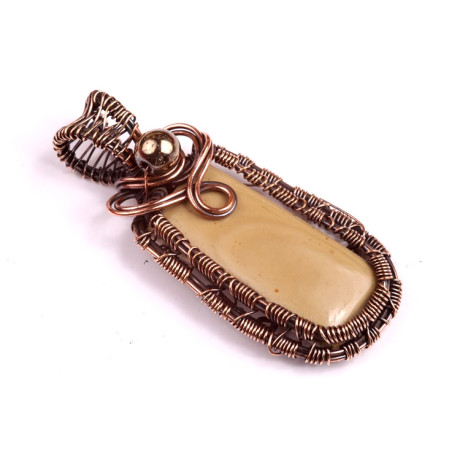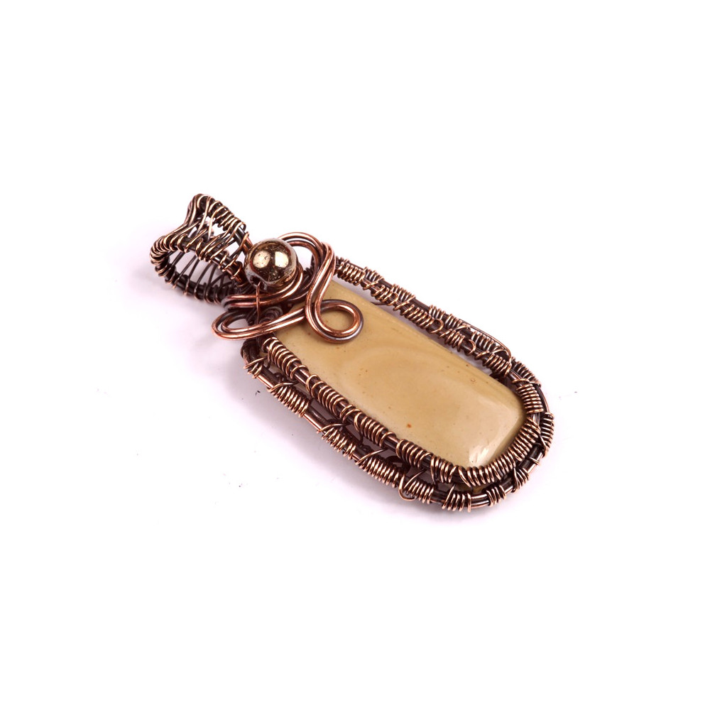Měděný drátek je pečlivě spleten do ozdobných vzorů, které přidávají přívěsku na uměleckém zpracování a zároveň zajišťují kámen v pevné, avšak jemné konstrukci. Korálek v horní části přívěsku dodává designu sofistikovanost a lesk, čímž tento šperk povyšuje na skutečný módní klenot.