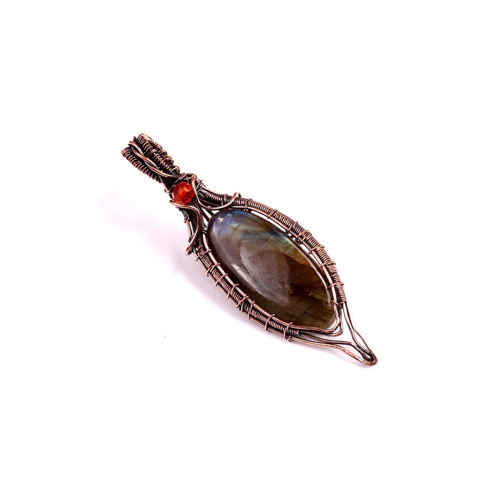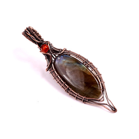 Drátkování je provedeno s precizností a elegancí, vytvářející jemné vzory, které dokonale rámují kámen a poskytují šperku robustní, avšak jemný vzhled. Teplé měděné tóny vytvářejí příjemný kontrast k tmavým a zářivým barvám labradoritu, čímž tento přívěsek působí harmonicky a výrazně.
