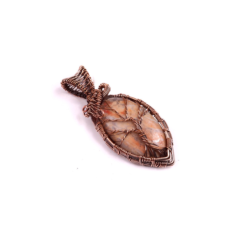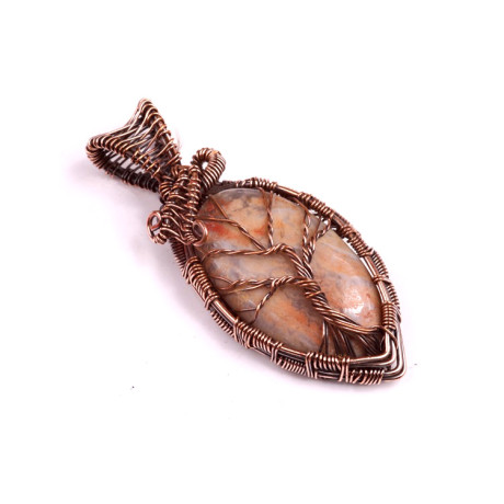 Měděný drátek obtočený kolem kamene tvoří složitý vzor stromu života, což dodává přívěsku symbolický význam. Strom života je silným symbolem růstu, síly a propojení s přírodou. Drátkování dodává přívěsku nejen estetickou hodnotu, ale také pevnost a stabilitu.