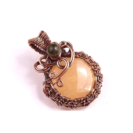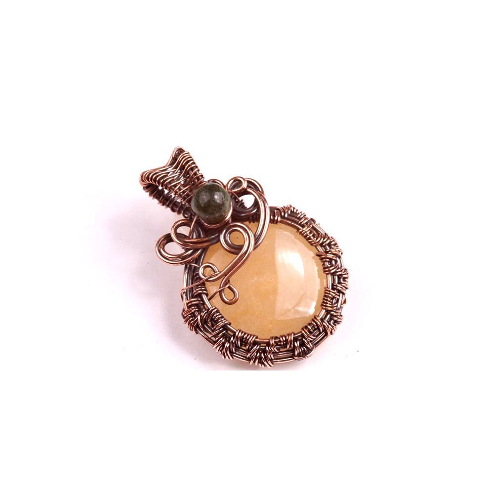 Měděný drátek, který je precizně spleten kolem kamene, vytváří elegantní spirálové vzory, které dodávají přívěsku na sofistikovanosti a uměleckém zpracování. V horní části je přívěsek doplněn malým zeleným kamenem, který vytváří příjemný kontrast k teplým tónům kalcitu a mědi.