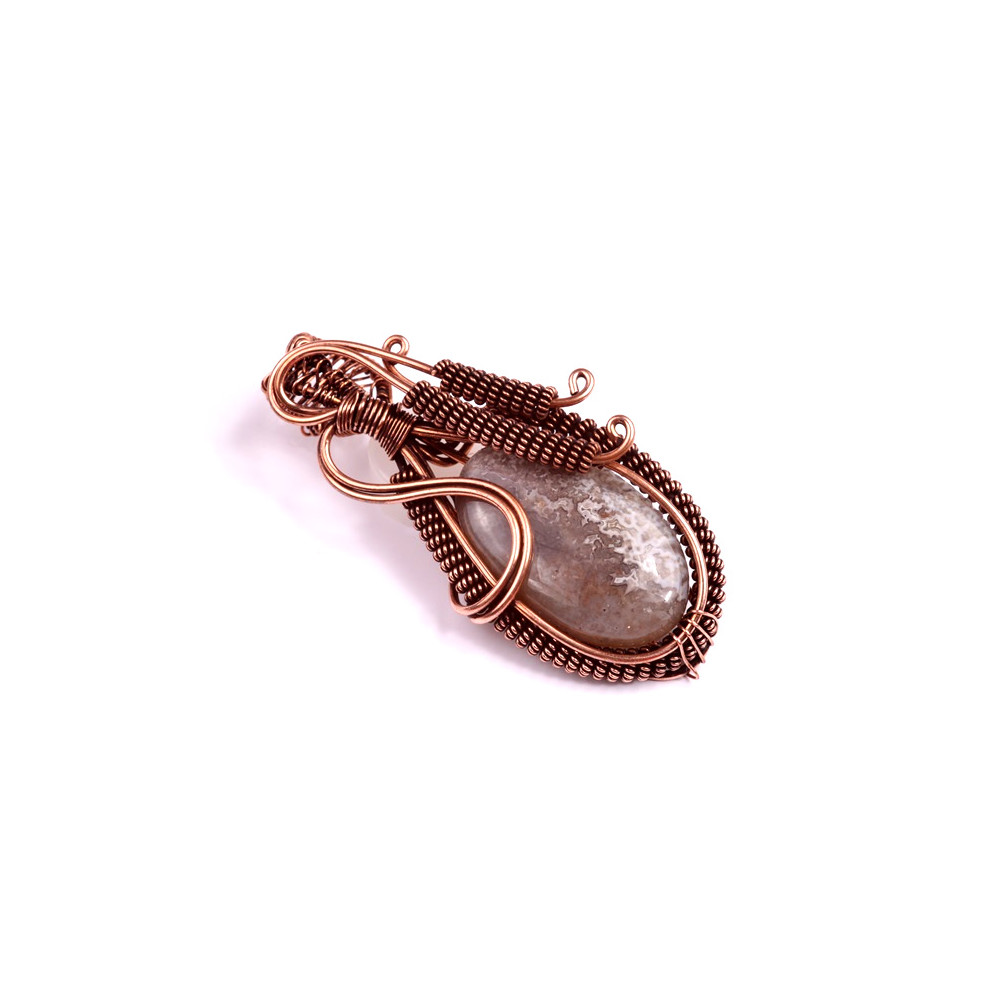 Drátování: Měděný drát je pečlivě zpracován do složitého a elegantního designu, který dokonale obepíná kámen a zvýrazňuje jeho krásu. Drát je ručně tvarován do detailních křivek a vzorů, což dodává přívěsku umělecký vzhled.
