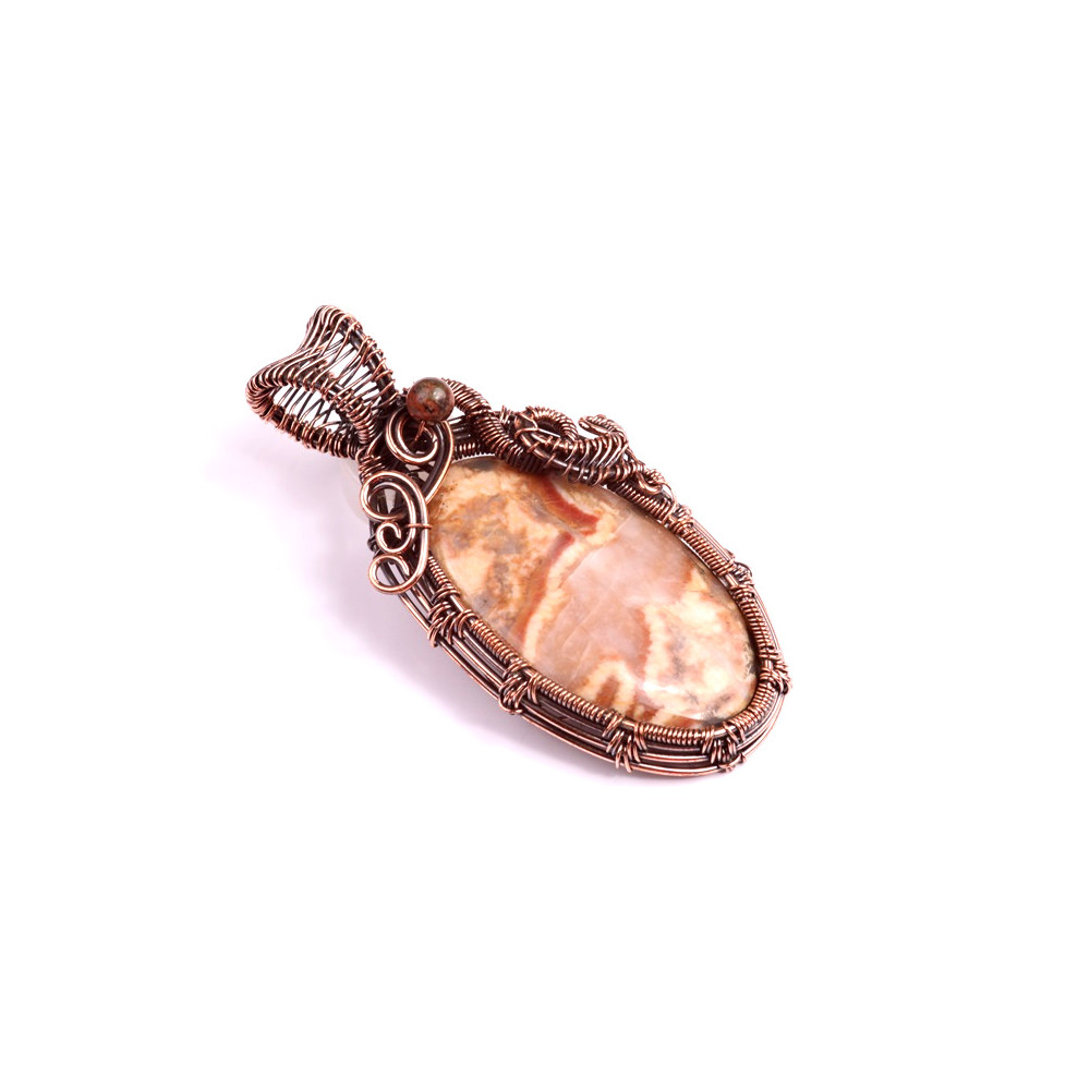 Drátování: Měděný drát je ručně tvarován do složitých křivek a ornamentů, které tvoří elegantní a zároveň pevné uchycení kamene. Drátovaný design zahrnuje ozdobné detaily, které přidávají přívěsku na umělecké hodnotě.