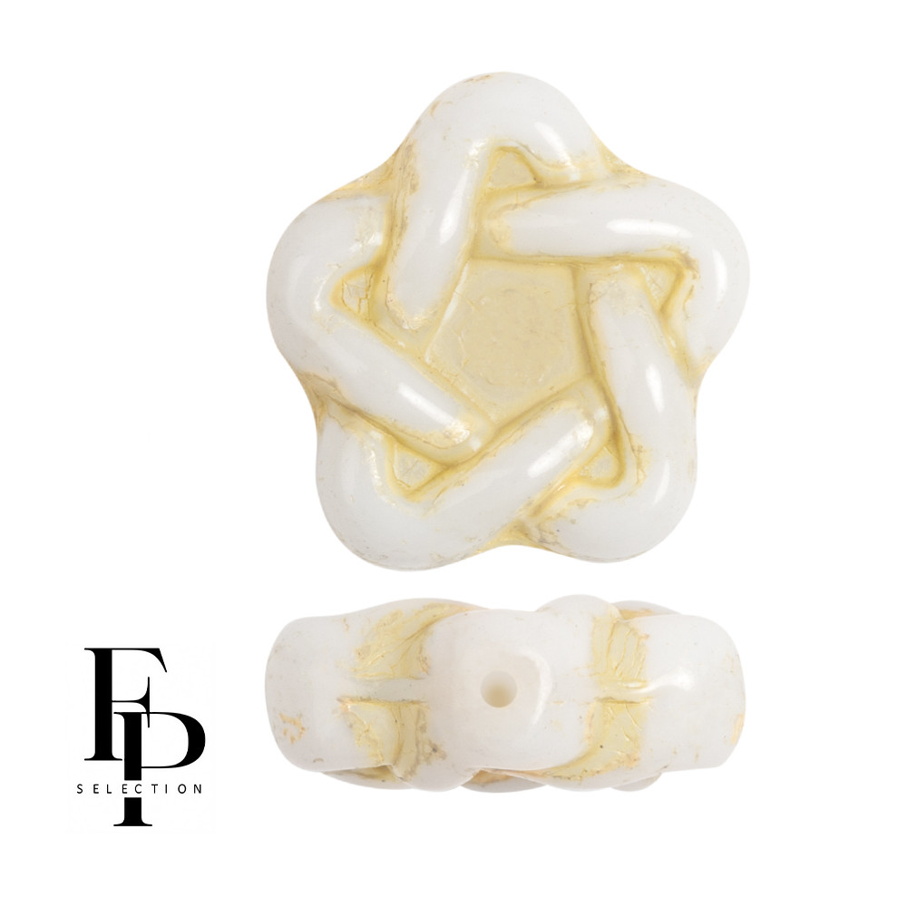 Krémově bílá barva s jemným žlutým nádechem v prohlubních dodává těmto skleněným korálkům Elegant Star FP Selection® autentický historický vzhled. Co mě na nich nejvíc baví, je jejich propracovaný tvar propletené hvězdy o rozměru 12 x 13 mm, který v každém šperku vytvoří zajímavý 3D efekt. Skvěle se hodí jako centrální motiv do náušnic nebo náhrdelníků, kde je můžete snadno nakombinovat s drobnějším materiálem, jako je klasický rokajl Preciosa 10/0, čímž podtrhnete jejich unikátní geometrii a precizní české sklo.