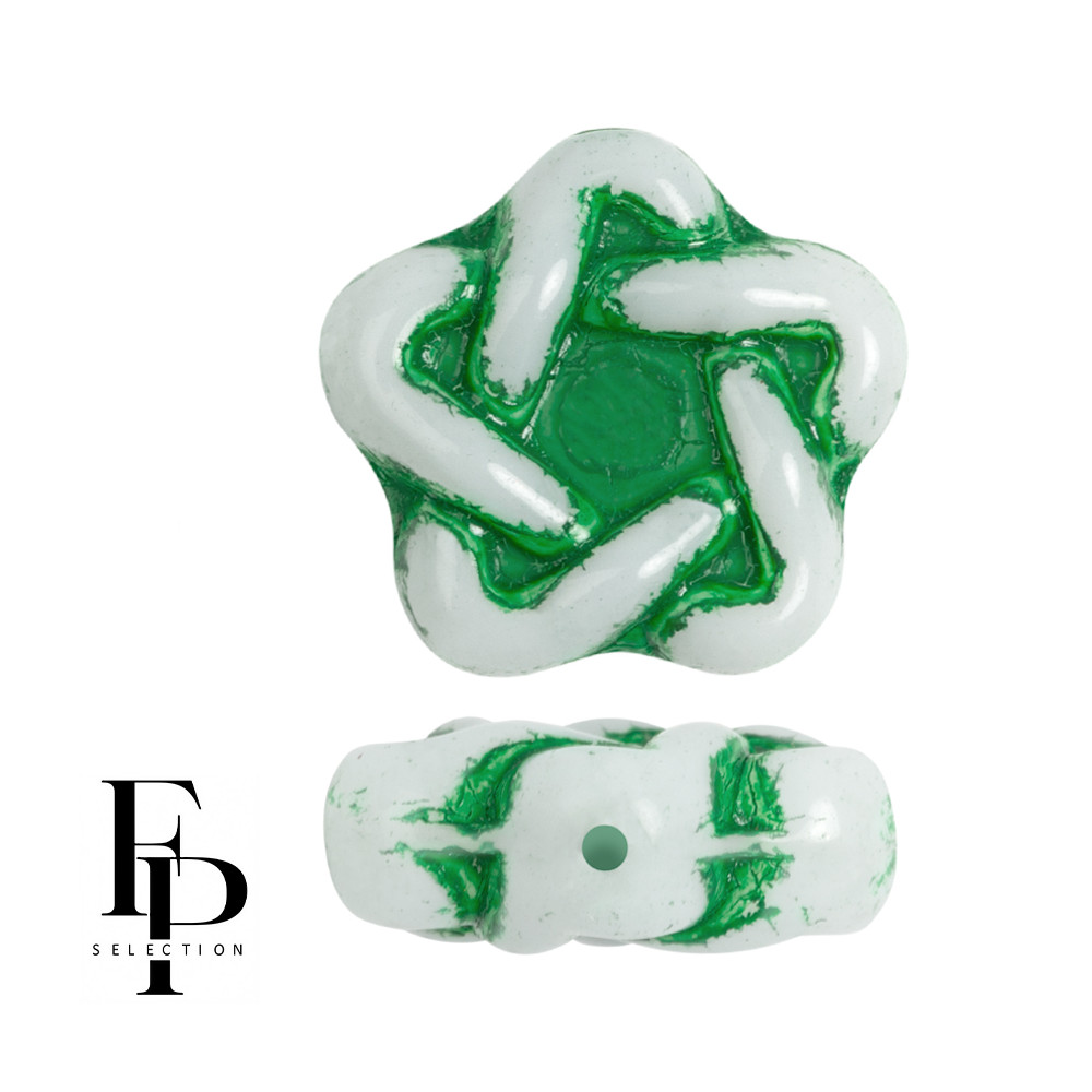 Green Garden odstín s výraznou patinou v prohlubních definuje unikátní charakter těchto mačkaných korálků ve tvaru pěticípé hvězdy. Rozměr 12 x 13 mm a precizní zpracování z kvalitního českého skla z nich činí ideální centrální prvek pro náhrdelníky i náušnice s přírodním nádechem. Texturovaný povrch v kombinaci s neprůhledným bílým základem skvěle ladí s korálky Preciosa, které podtrhnou jejich rustikální a nadčasový vzhled.
