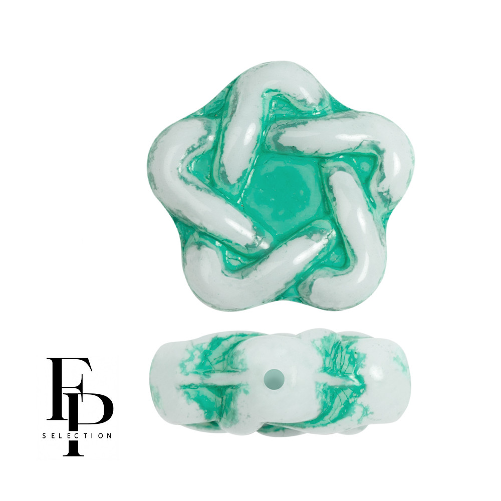 Tyrkysová barva s jemným bílým mramorováním definuje tyto originální skleněné korálky ve tvaru pěticípé hvězdy o rozměru 12 x 13 mm. Mačkané korálky z českého skla vynikají plastickým reliéfem, který připomíná propletené provazy, a skvěle se doplňují například s drobným rokajlem Preciosa 10/0. Díky průtahu 0,8 mm jsou vhodné pro navlékání na jemné drátky i nitě při tvorbě náušnic nebo efektních přívěsků, kde plně vynikne jejich detailní povrchová úprava s nádechem patiny.