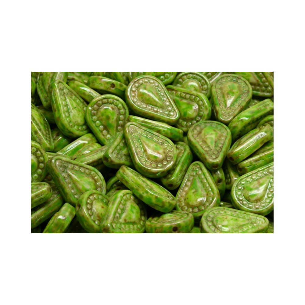 Sytě zelená barva a unikátní tvar Filigree Tear Drop Beads o velikosti 14 x 10 mm představují vrchol české sklářské tradice. Rodinná firma Rutkovský vyrábí tyto skleněné korálky technikou ručního lisování, která zaručuje precizní detaily každého kusu.