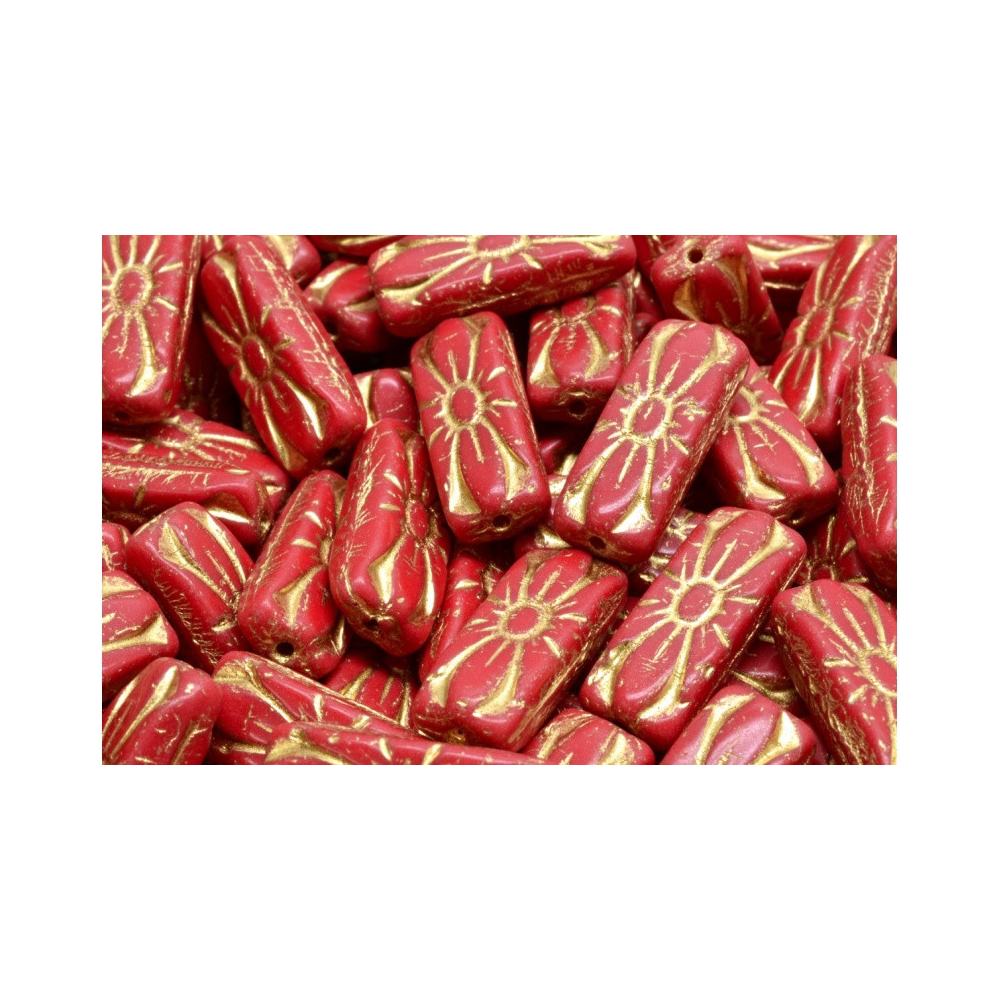 Sytě červená barva v kombinaci se zlatavým dekorem evokuje hřejivé paprsky zapadajícího slunce nad rozkvetlou zahradou. Tyto skleněné korálky s mezinárodním názvem Flower Rectangle Beads od renomovaného českého výrobce Rutkovsky představují dokonalou symbiózu tradičního řemesla a moderního designu. Díky svému unikátnímu rozměru 20 x 8 mm se stanou nepřehlédnutelným středobodem každého kreativního projektu, kterému dodají nádech luxusu a originality.