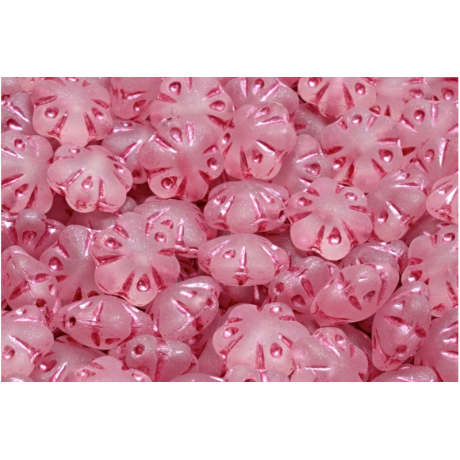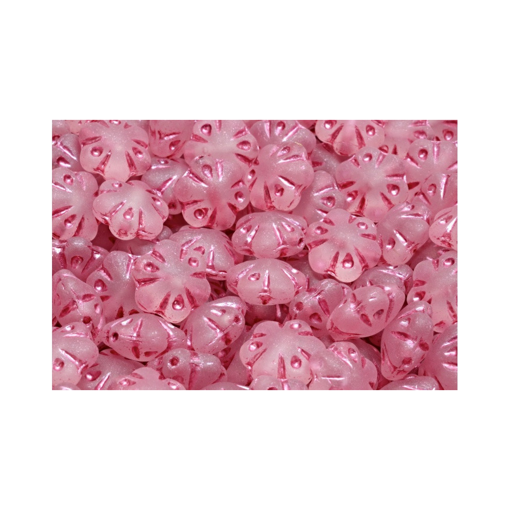 Růžová barva v jemném matném tónu s výrazným metalickým akcentem v prohlubních definuje tyto skleněné korálky typu Folklore Flower Beads, které vnášejí do moderní tvorby nádech tradice. Tento specifický povrch vytváří zajímavý kontrast mezi saténovým tělem okvětních lístků a hlubšími, lesklými detaily uprostřed květiny.