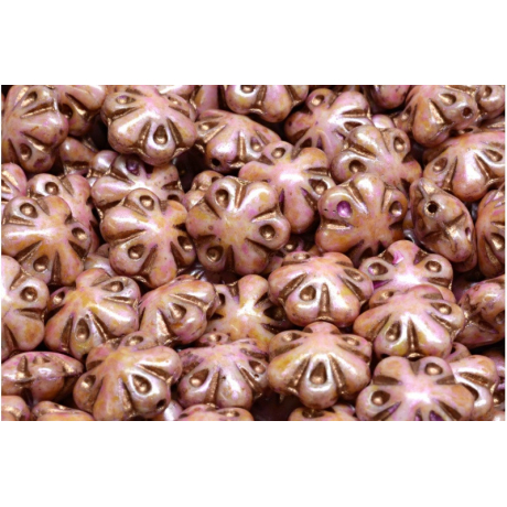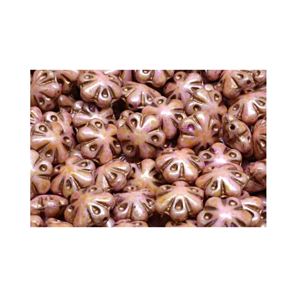 Béžový základ s jemným růžovým nádechem a bronzovým listrem charakterizuje tyto skleněné korálky kytičky o rozměru 11 x 11 mm. Výrobce Rutkovsky dbá na precizní zpracování každého kusu, což zajišťuje konzistentní velikost a hladký průtah 0,8 mm. Tento rozměr je ideální pro navlékání na běžné bižuterní dráty i pevnější nitě, přičemž hrany otvoru jsou šetrné k použitému materiálu a minimalizují riziko třepení.