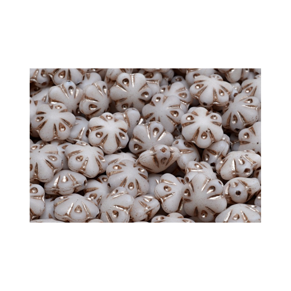 Bílá křídová barva v kombinaci s jemným bronzovým dekorem v rýhách okvětních lístků dává těmto prvkům nezaměnitelný starobylý vzhled. Co mě na nich baví je jejich velikost 11 x 11 mm, která je ideální pro tvorbu dominantnějších náušnic nebo jako centrální motiv v náramcích. Tyto skleněné korálky kytičky od tradičního českého výrobce Rutkovsky vynikají precizním zpracováním a krásně definovaným tvarem, který dokonale evokuje lidovou tvorbu a tradici.