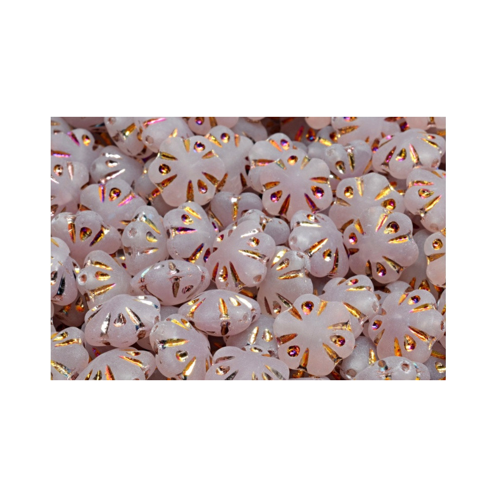 Jemná pudrově růžová barva v kombinaci s matným, lehce opalizujícím povrchem definuje tyto skleněné korálky Folklorní květiny. Každý kus nese detailní reliéf okvětních lístků, které jsou v prohlubních zvýrazněny zlatým dekorem, což dodává šperku nádech starobylé elegance a hloubku. Tento specifický design vychází z bohaté historie českého sklářství a přenáší tradiční motivy do moderní bižuterie.