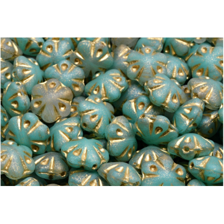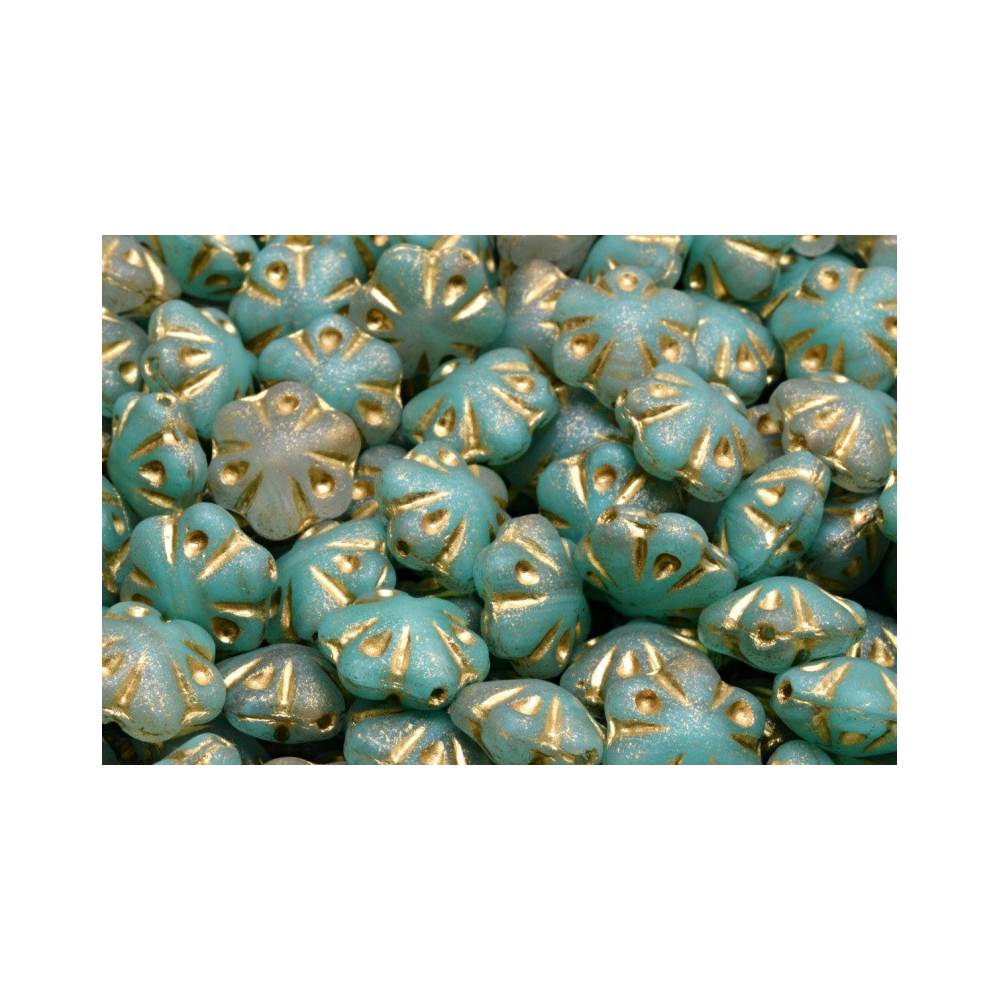 Tyrkysový odstín s jemným zlatým dekorem vnáší do šperkařské tvorby nádech starožitné elegance a lidových tradic. Tyto skleněné korálky kytičky o rozměru 11 x 11 mm představují precizní českou výrobu z dílny Rutkovsky, která je ceněna pro svůj smysl pro detail a vysokou kvalitu materiálu. Každý kus je opatřen jemným prolisem, který zvýrazňuje květinový motiv a dodává výslednému šperku hloubku a zajímavou texturu.