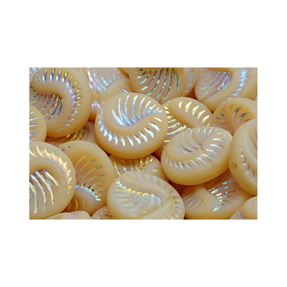 Jemná písková barva v kombinaci s duhovým odleskem v drážkách definuje tyto Fossil Coin Beads od renomovaného výrobce Rutkovský. Na rozdíl od běžných plochých korálků nabízí tento tvar hlubokou texturu inspirovanou přírodními zkamenělinami, která dodává každému šperku autentický, organický nádech. Ručně mačkané sklo z Jizerských hor vyniká precizním zpracováním, kde každá drážka spirály zachycuje světlo jiným způsobem díky povrchové úpravě AB.