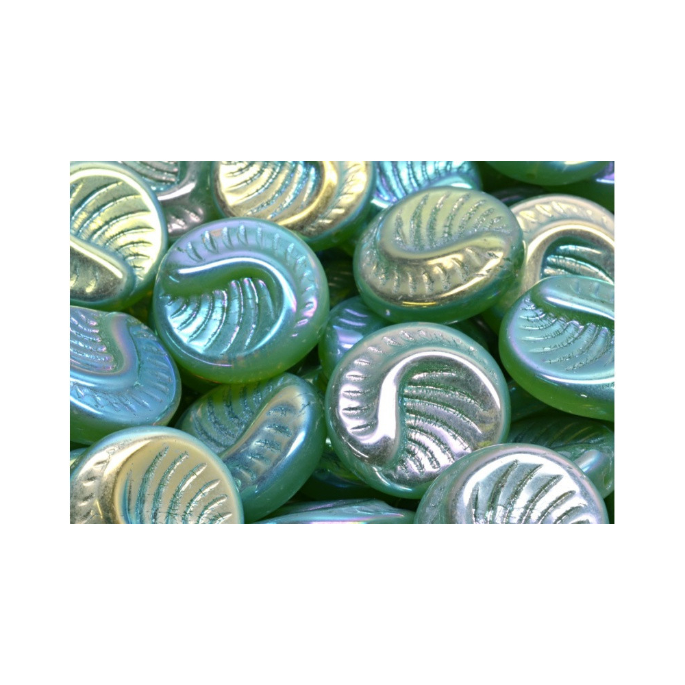 Mátově zelená barva s jemným perleťovým nádechem se snoubí v unikátním tvaru Fossil Coin Beads, který pochází z dílny rodinné firmy Rutkovský. Tyto ručně mačkané skleněné korálky o rozměru 19 x 19 mm představují vrcholné tradiční české sklářství a díky svému detailnímu reliéfu zkameněliny dodají každému šperku nádech historie a přírodní elegance. Jsou ideální volbou pro tvorbu dominantních náhrdelníků, náušnic nebo jako centrální prvek v technice beadweaving, kde vynikne jejich lesklý povrch s duhovými odlesky, které se mění s každým dopadem světla.