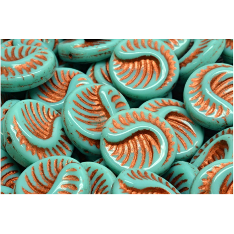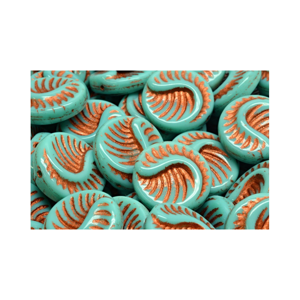 Tyrkysový odstín mořské hladiny v kombinaci s hřejivým leskem mědi vytváří z těchto Fossil Coin Beads od rodinné firmy Rutkovský skutečný umělecký kousek. Každý korálek nese detailní reliéf spirálovité fosilie, který je zdůrazněn precizním nánosem měděné patiny, čímž vzniká fascinující vizuální hloubka. Tyto ručně mačkané skleněné korálky ztělesňují tradiční české sklářství a přinášejí do vaší tvorby kousek historie v moderním designovém provedení o rozměru 19 x 19 mm.