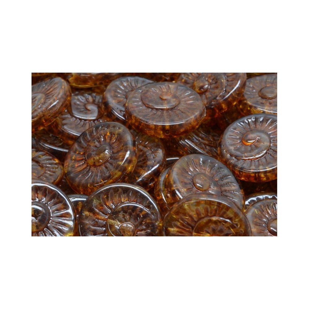 Hnědá barva s jemným žíháním v dekoru Crystal Travertine propůjčuje těmto skleněným prvkům autentický přírodní vzhled připomínající vzácné kameny. Fossil Shell Beads o rozměru 18 x 18 mm vynikají precizním reliéfem inspirovaným pravěkou zkamenělinou ammonitu, který zaujme na první pohled svou hloubkou. Každý detail na povrchu je výsledkem pečlivého procesu, díky kterému získává šperk nezaměnitelnou texturu a vizuální dynamiku.
