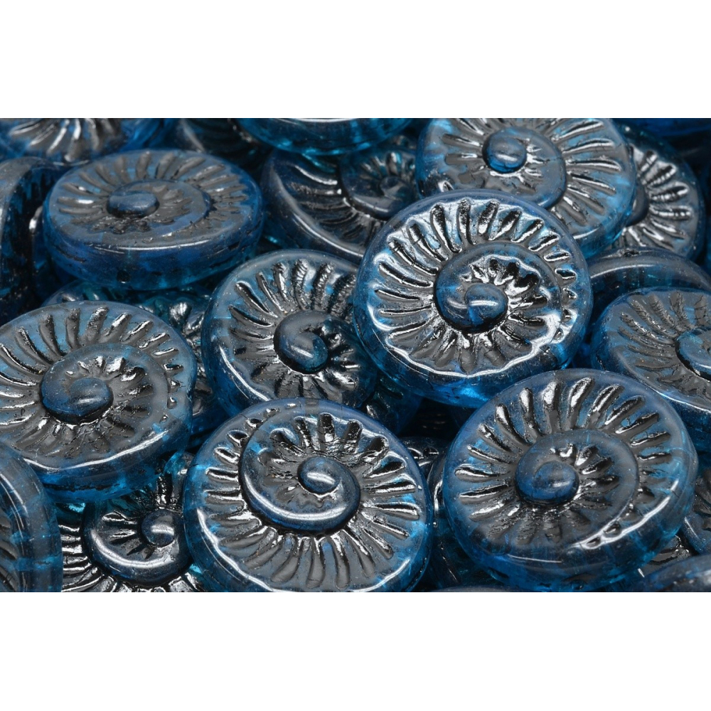 Hluboce modrý odstín akvamarínu s černým patinováním dodává těmto Fossil Shell Beads neuvěřitelnou hloubku a starobylý vzhled. Co mě na nich nejvíc baví, je právě ten kontrast mezi průsvitným modrým sklem a tmavými detaily v prolisech spirály, což perfektně imituje pravé zkameněliny a dodává šperku nádech historie.