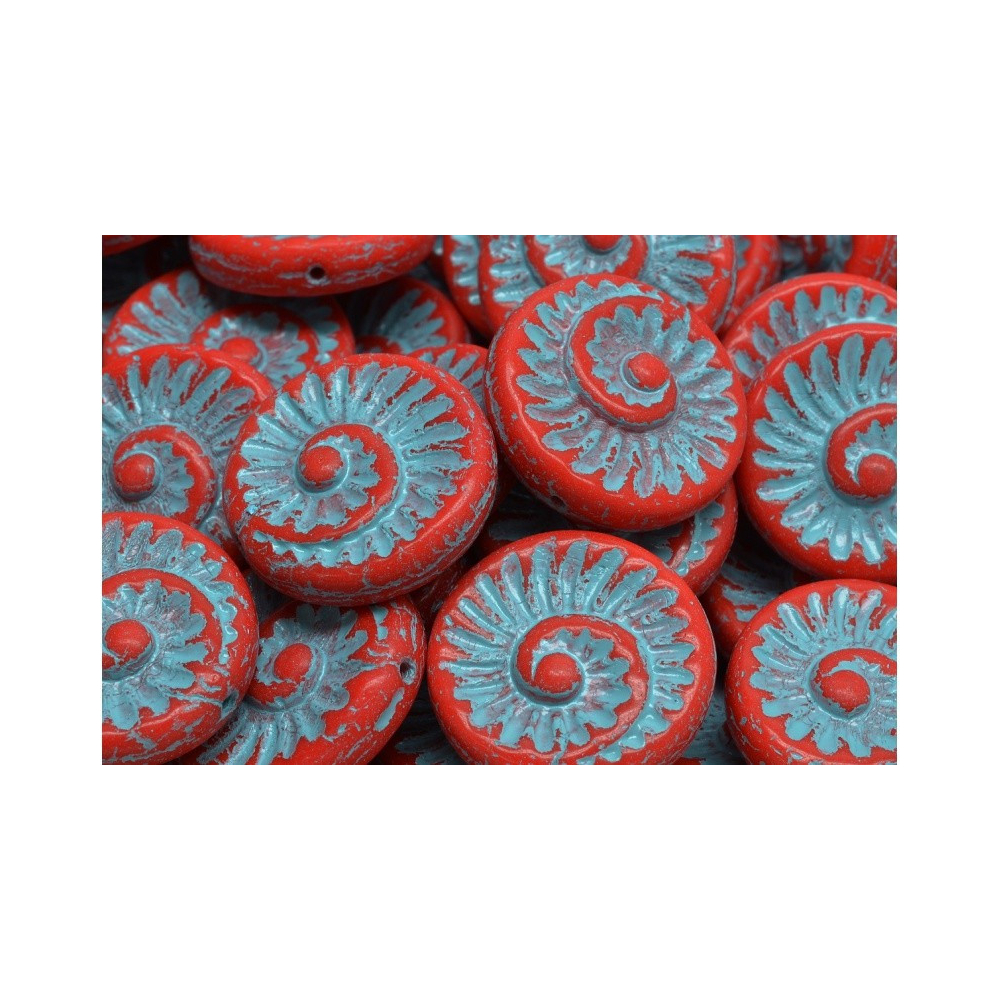 Sytá červená barva s kontrastním světle modrým dekorem v hlubokých detailech dodává těmto Fossil Shell Beads o velikosti 18 x 18 mm naprosto nezaměnitelný charakter. Každý kus je výsledkem poctivé práce rodinné firmy Rutkovský, která v České republice udržuje tradici ručně mačkaných skleněných korálků. Co mě na těchto mušličkách nejvíc baví, je jejich organický tvar, který působí velmi přirozeně a v kombinaci s matným povrchem dodává šperkům starobylý, až historický nádech.
