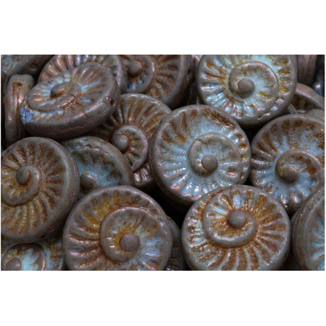 Hnědá patina v kombinaci s jemným tyrkysovým nádechem a měděnými odlesky dodává těmto Fossil Shell Beads nezaměnitelný starožitný vzhled. Povrchová úprava typu Picasso zvýrazňuje každou rýhu a spirálu, čímž vytváří texturu, která je příjemná na dotek i na pohled. Díky ručnímu lisování je každý korálek unikátní, což vašim náušnicím nebo náramkům dodá punc exkluzivity, kterou u strojové výroby nenajdete.