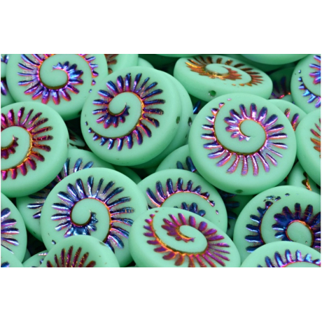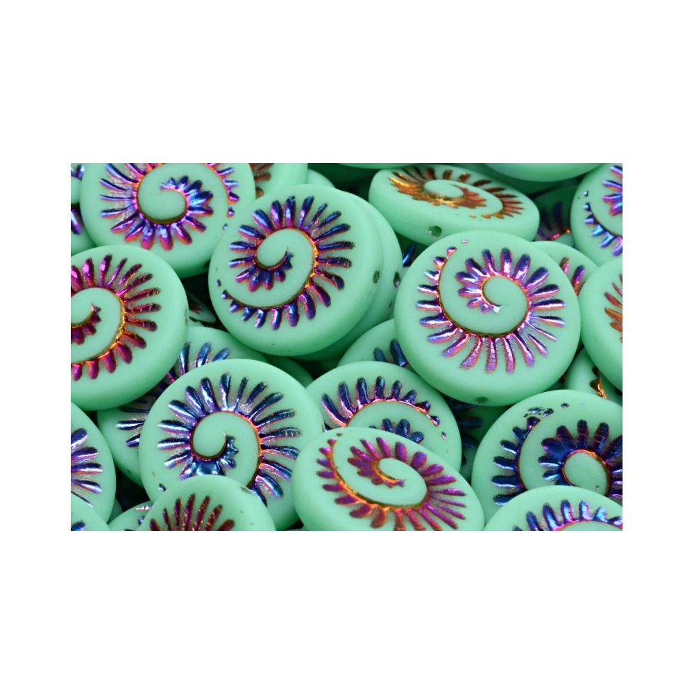 Co mě na nich nejvíc baví, je jejich detailní spirálový reliéf, který připomíná zkamenělou mušli nebo amonit. Díky velikosti 18 x 18 mm skvěle fungují jako ústřední prvek náušnic nebo jako výrazný detail v náhrdelníku. Matný povrch mentolového skla krásně kontrastuje s metalickým leskem v drážkách, což dodává hotovému dílu hloubku a plastičnost.