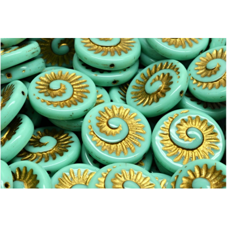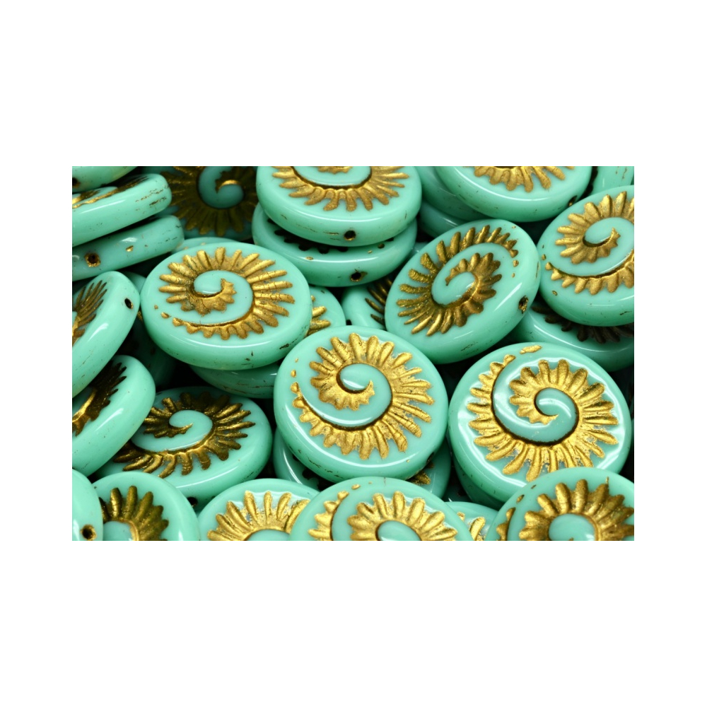 Technika precizního vtlačování reliéfu do žhavé skloviny vytváří unikátní motiv spirály, který v kombinaci s kovovým leskem připomíná vzácné zkameněliny. Tento materiál je ideální pro tvorbu výrazných náušnic nebo jako centrální prvek v náhrdelnících, kde vynikne jejich jedinečná forma. Tyrkysová barva se zlatým finišem dodává korálkům starožitný nádech, který je aktuálně velmi trendy v boho-chic stylu.