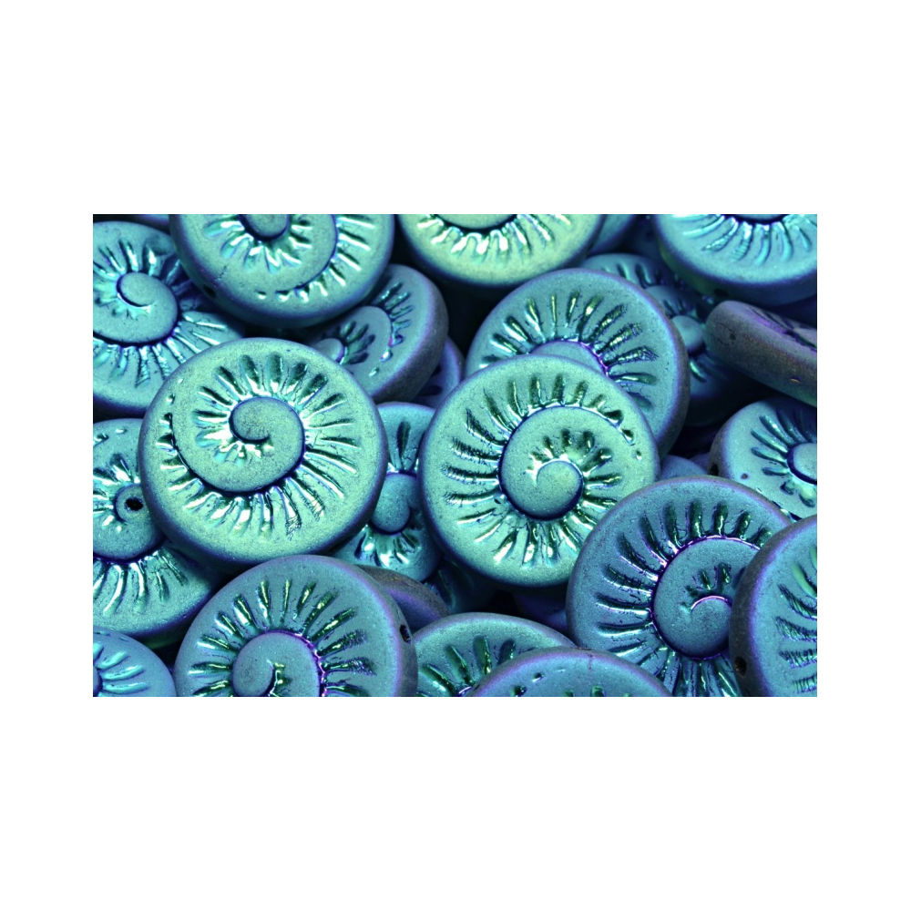 Tyrkysová barva s fialovými odlesky v jemných rýhách reliéfu vytváří fascinující vizuální hloubku, která nejlépe vynikne při dopadu přirozeného světla. Povrchová úprava typu iris v kombinaci s matným podkladem zdůrazňuje spirálovitý tvar Fossil Shell Beads, čímž z nich činí nepostradatelný prvek pro boho náhrdelníky i sofistikované letní doplňky.