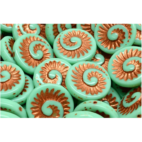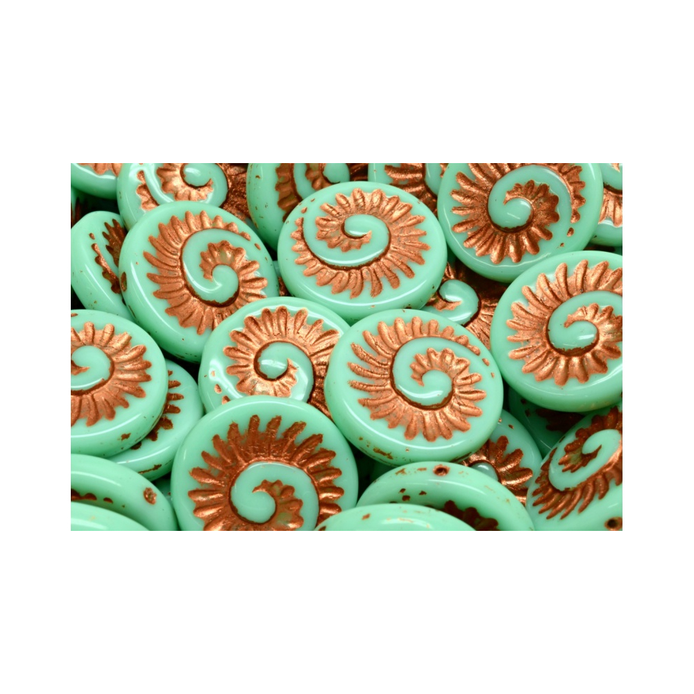 Tyrkysový podklad v kombinaci s bohatým měděným dekorem definuje tyto výjimečné Fossil Shell Beads od rodinné firmy Rutkovský. Na rozdíl od běžných kulatých korálků nabízí tento tvar fascinující spirálovitou strukturu, která připomíná zkamenělé schránky dávných mořských živočichů a dodává šperkům hloubku. Každý korálek nese otisk precizní práce, kde se potkává přírodní inspirace s mistrovským zpracováním skla.
