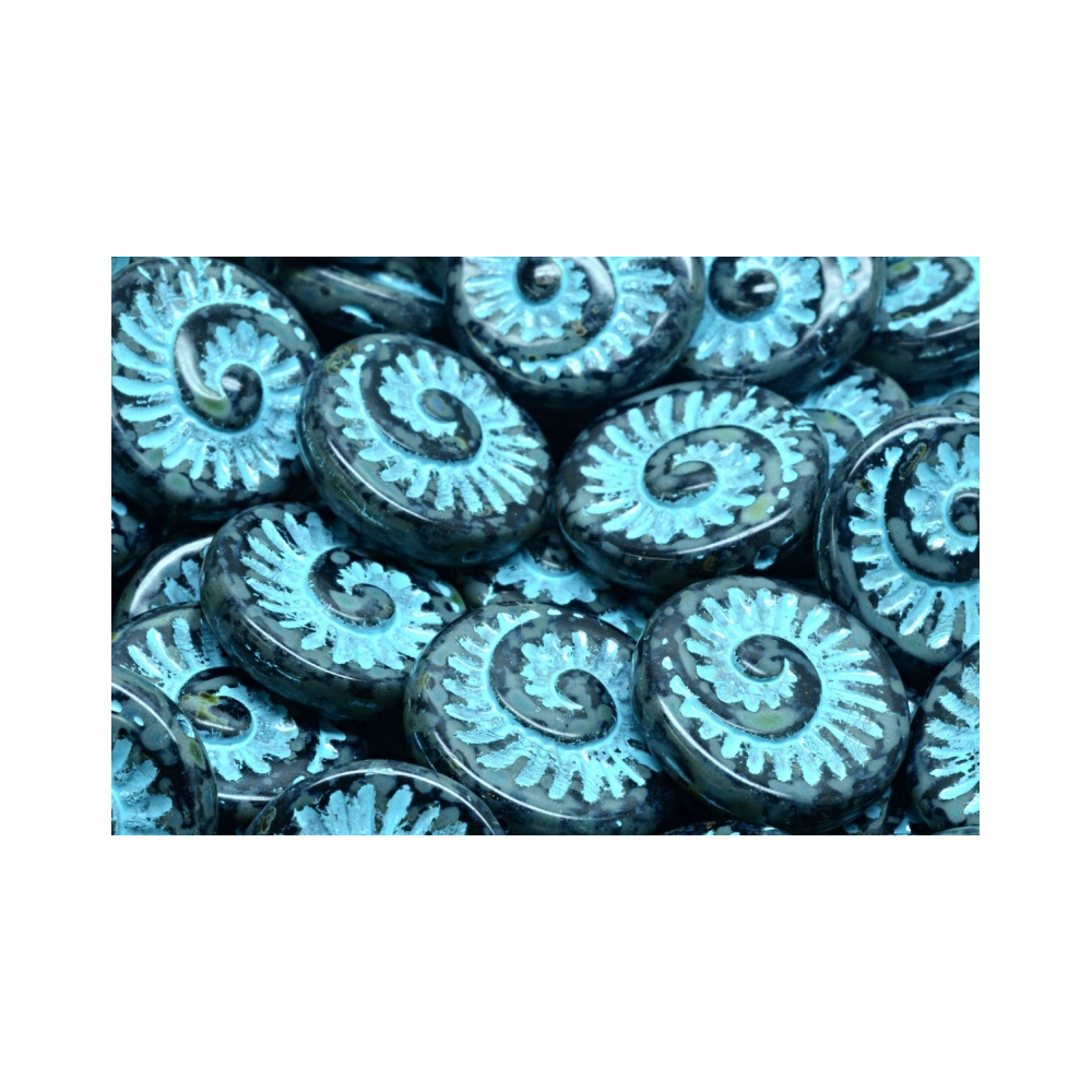 Tyrkysová barva v kombinaci s temně černým základem dává těmto Fossil Shell Beads neuvěřitelnou vizuální hloubku, která připomíná vzácné nálezy z mořského dna. Co mě na nich nejvíc baví, je výrazný kontrast mezi lesklým povrchem skla a matně tyrkysovou patinou v prolisech spirály, což z každého kusu dělá nezaměnitelný originál. Tyto české skleněné korálky vnesou do vašich projektů organický prvek a nádech dávné historie.