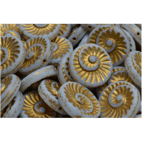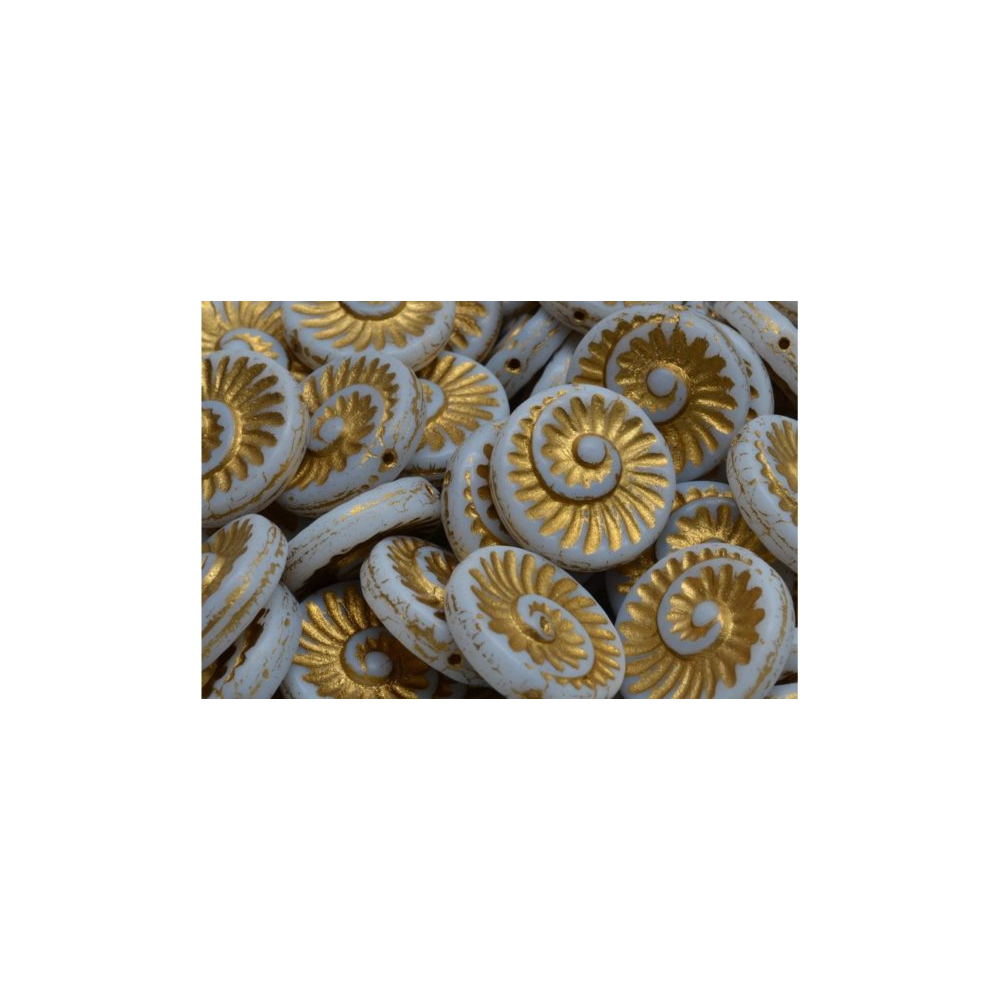 Tradiční české sklářství se v tomto případě snoubí s precizním ručním lisováním, díky čemuž vznikají skleněné korálky s neopakovatelným charakterem a hloubkou detailu v každém záhybu. Zlatá barva 54302 zvýrazňuje jemnou texturu spirály, která je inspirována přírodními tvary zkamenělin.