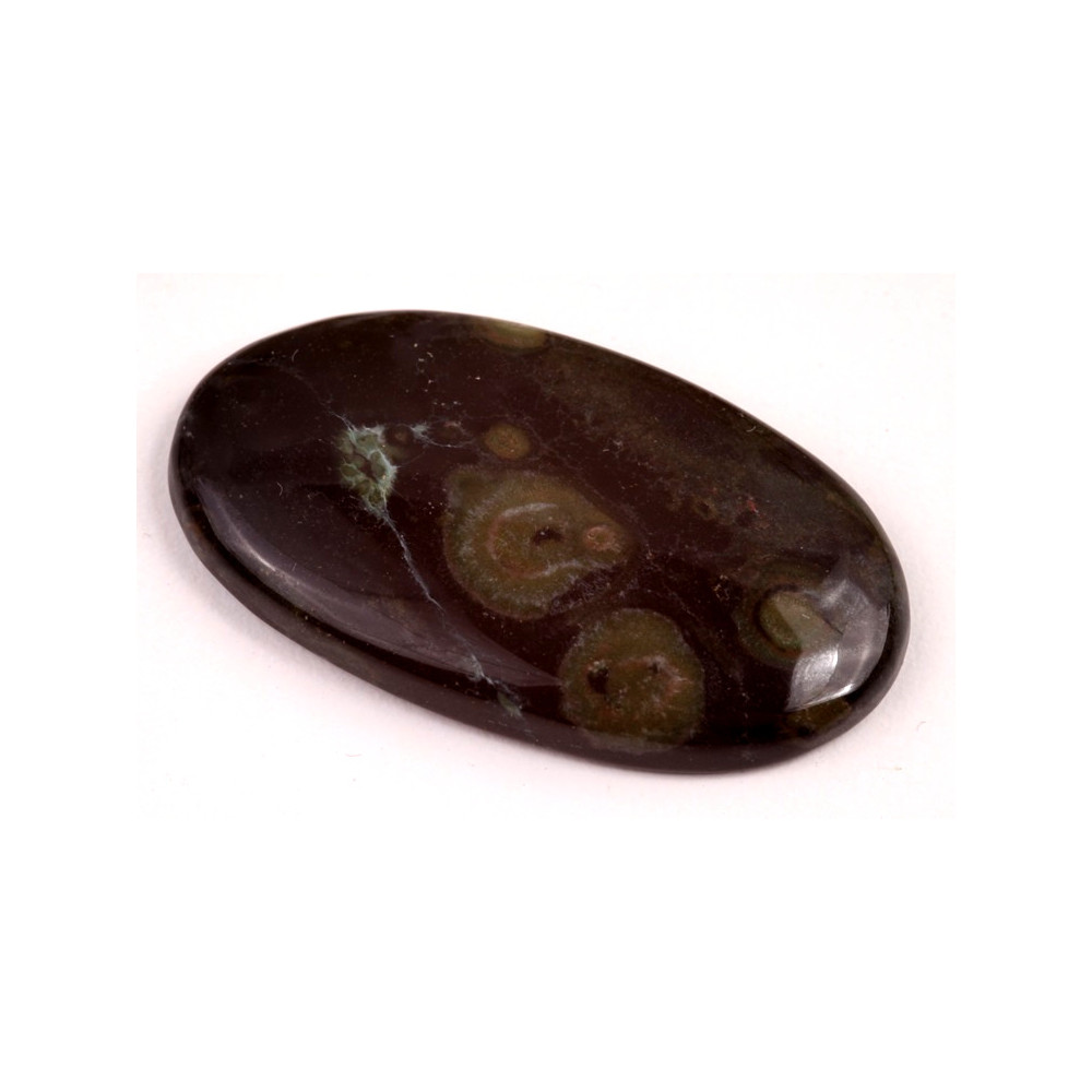 Galaxy Star Jasper je jedinečný přírodní kámen, který svým temně hnědým až zeleným podkladem, zdobeným kruhovými vzory připomínajícími vzdálené galaxie, přitahuje pozornost každého milovníka minerálů a šperků. Tyto výrazné kruhové obrazce vytváří fascinující efekt připomínající pohled do noční oblohy plné hvězd. Tento kabošon je ideální volbou pro ty, kteří hledají výjimečný kámen s mystickým a hlubokým vzhledem.