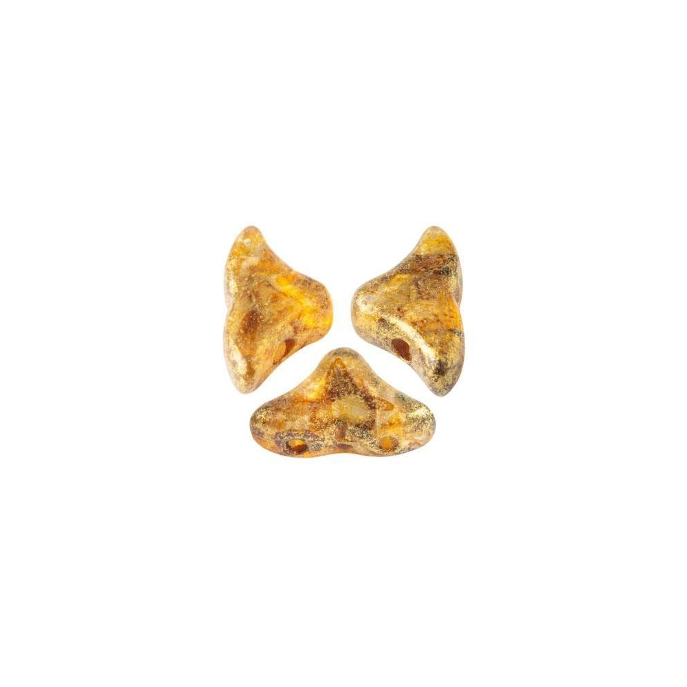 Zlaté odlesky na čirém základu jsou aktuálním hitem v oblasti autorských šperků, kde dominují organické tvary a sofistikované textury. Unikátní korálek Hélios® par Puca® o rozměrech 6 x 10 mm v odstínu Crystal Gold Spotted představuje dokonalé spojení precizní české sklářské tradice a šarmu, který do své tvorby vkládá francouzský design. Díky svému specifickému trojúhelníkovému tvaru se dvěma otvory o velikosti 0,8 mm otevírá nové možnosti pro prostorové tvoření, kde se světlo krásně láme skrze transparentní sklo s metalickými akcenty. Pro harmonické barevné párování doporučujeme tento odstín doplnit o korálky crystal AB pro zvýraznění jiskry, nebo zvolit černý jet pro vytvoření luxusního kontrastu.