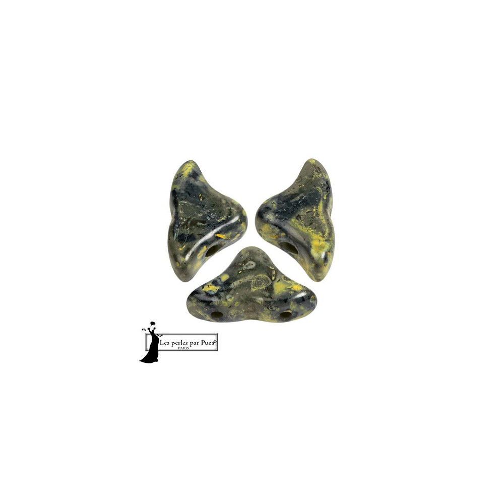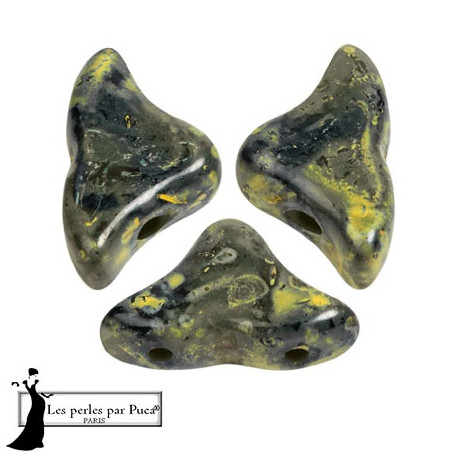 Povrchová úprava připomínající přírodní kámen kombinuje hlubokou černou, pískově béžovou a svěží žluté tóny, což vytváří organický a přitom moderní dojem. Díky svému geometrickému tvaru se tyto korálky stávají nepostradatelným prvkem pro šité šperky, kde je vyžadována preciznost a schopnost vytvářet složité prostorové struktury. Jsou navrženy tak, aby tvořily harmonický celek s dalšími tvary z kolekce, jako jsou například Amos® par Puca® nebo Arcos® par Puca®.