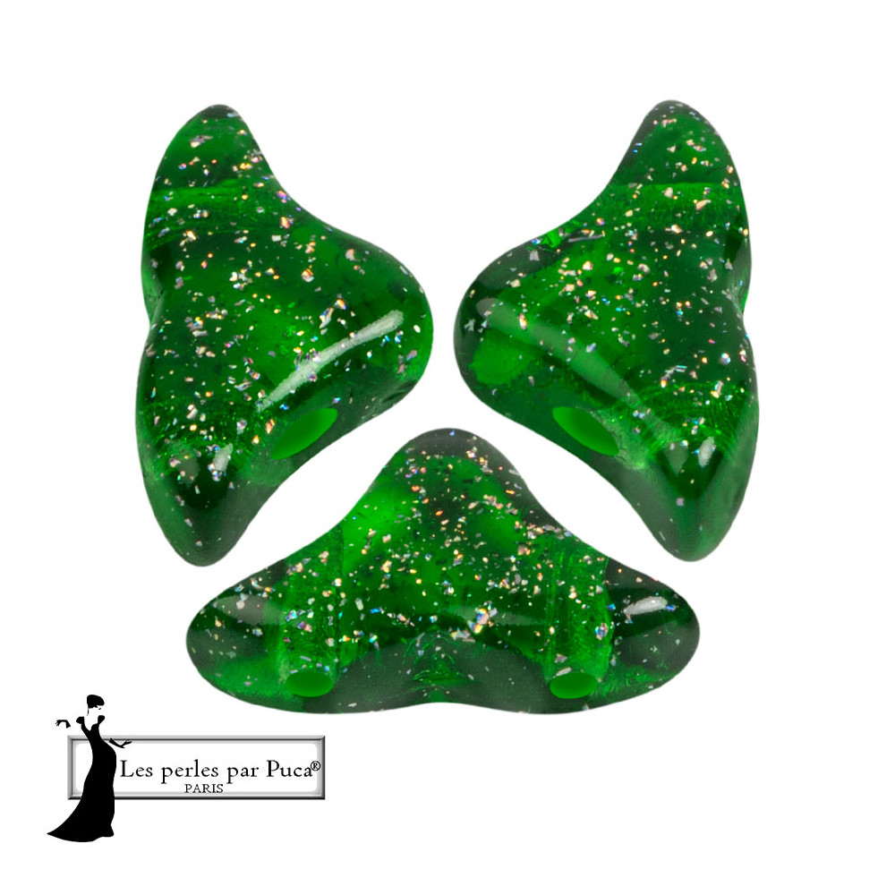 Sytě zelená barva s efektem hvězdné mlhoviny definuje tyto unikátní skleněné komponenty. Hélios® par Puca® vynikají organickým tvarem, který připomíná stylizovaný trojúhelník s jemnými křivkami. Jsou ideální pro tvorbu prostorových šperků a náročných geometrických vzorů.