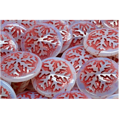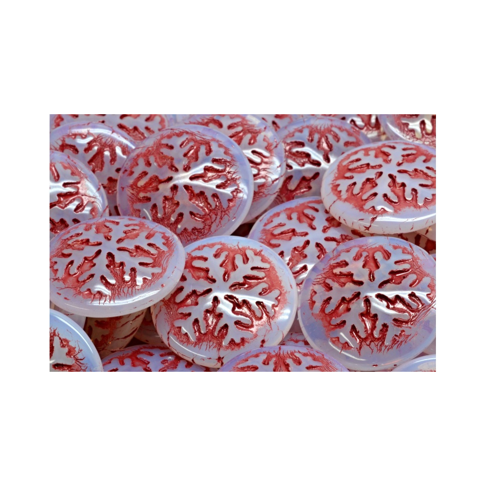 Opalizující sklo s detailně vylisovaným motivem vločky představuje precizní práci rodinné firmy Rutkovský, Česká republika. Tento skleněný kabošon o průměru 21 mm se vyznačuje polotransparentní mléčnou texturou, která v kombinaci s hlubokou vínovou pigmentací v reliéfu vytváří výrazný kontrast. Ruční výroba metodou mačkání skla do forem zaručuje vysokou estetickou hodnotu každého kusu, což z něj činí ideální volbu pro náročné šperkařské projekty vyžadující preciznost.