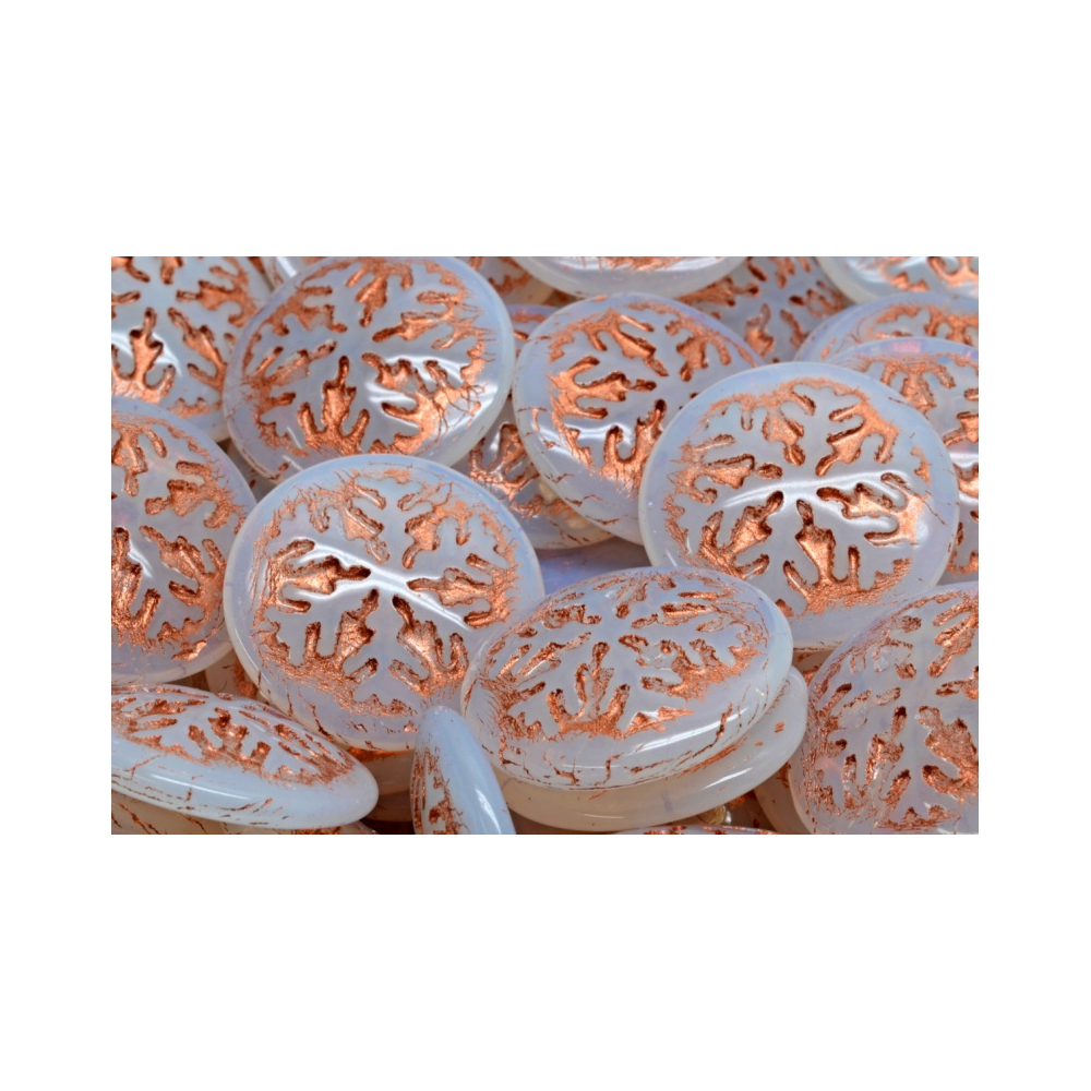 Mléčně opalizující základ s jemnými modravými odlesky tvoří elegantní pozadí pro detailně propracovaný motiv vločky. Tento skleněný kabošon o průměru 21 mm pochází z dílny rodinné firmy Rutkovský, která je synonymem pro špičkové tradiční české sklářství. Ruční lisování skla zajišťuje precizní zpracování každého kusu, kterému dominuje hřejivý měděný dekor s metalickým efektem.