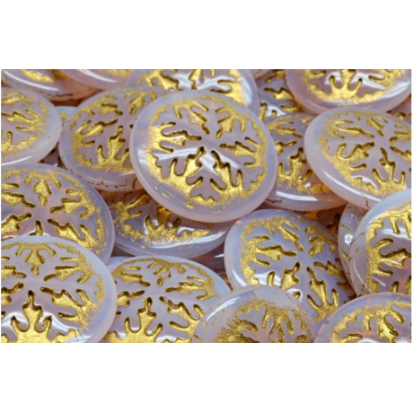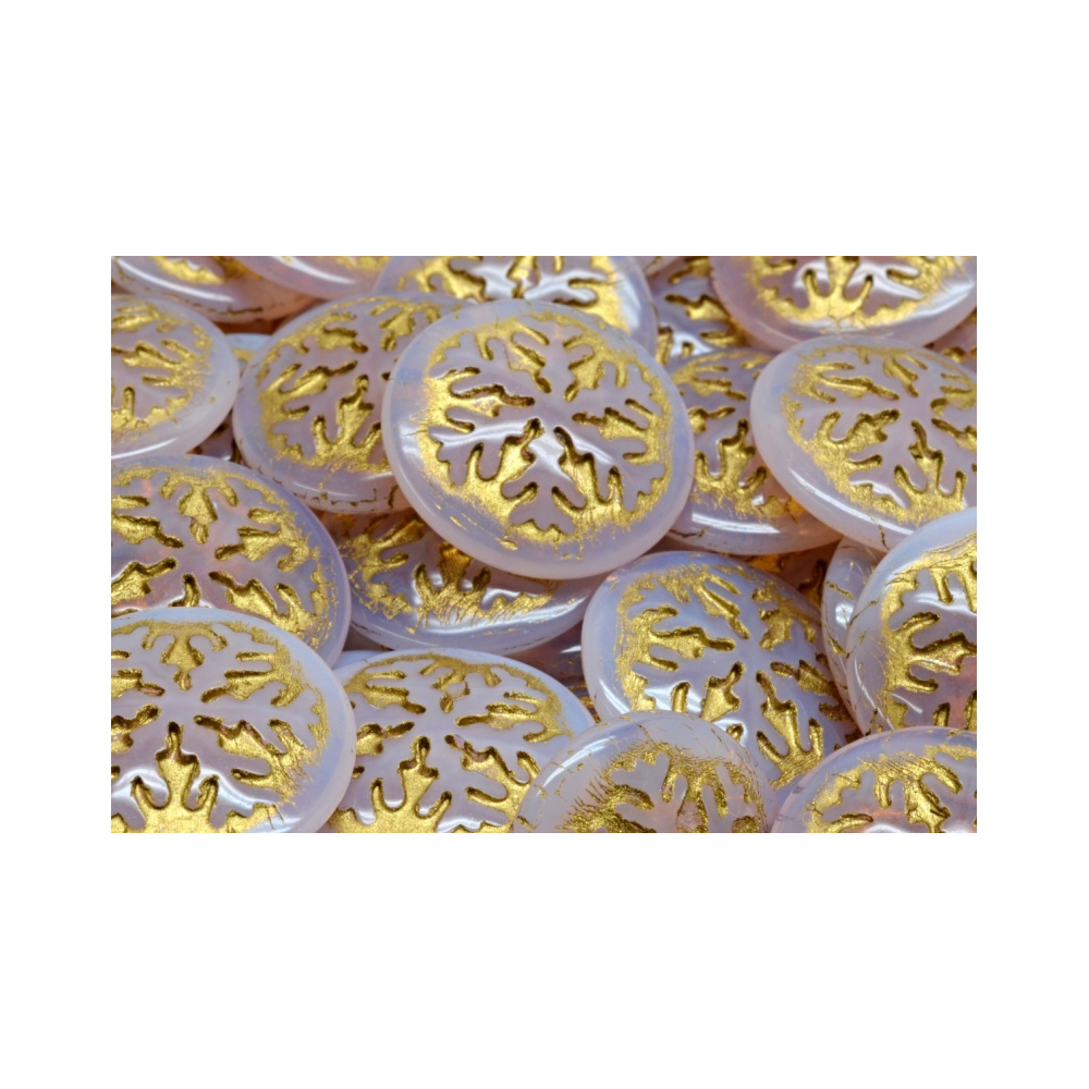 Jemně růžový opálový odstín v kombinaci s precizním zlatým dekorem vločky definuje tento luxusní šperkařský komponent. Tento skleněný kabošon o průměru 21 mm pochází z dílny rodinného výrobce Rutkovský, kde vzniká tradiční metodou ručního lisování skla. Každý kus nese stopu tradičního českého sklářství a vyniká jedinečnou hloubkou barev díky opálovému základu.