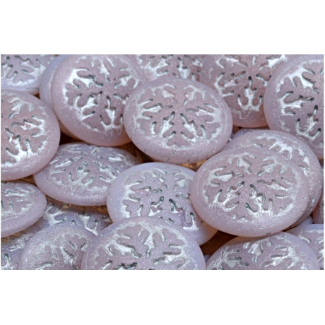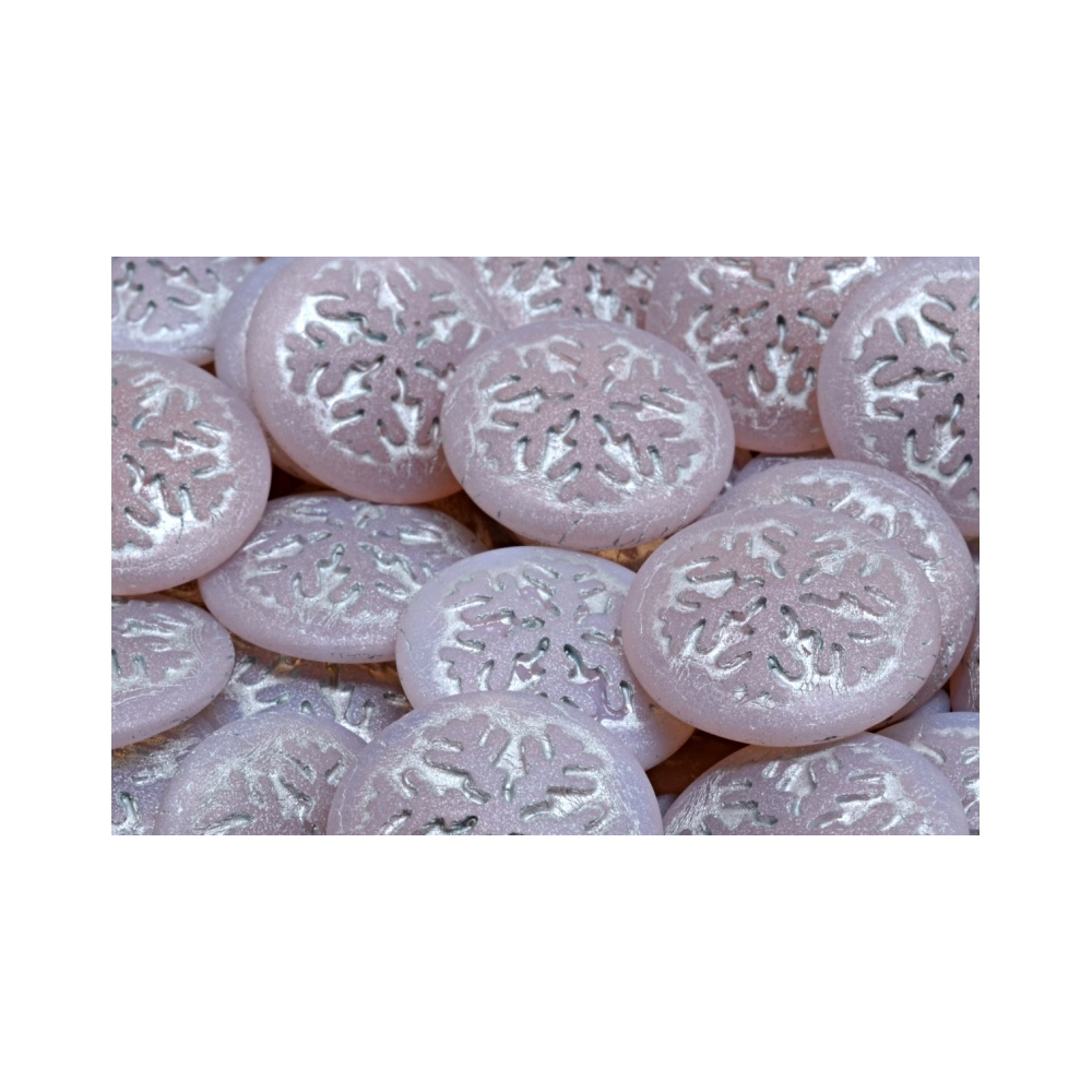21 mm průměr tohoto ručně mačkaného komponentu z rodinné hutě Rutkovský zaručuje precizní zpracování každého detailu. Růžová barva v kombinaci s jemným stříbrným dekorem zimní vločky vyniká na matném, lehce opalizujícím povrchu. Tato tradiční česká skleněná bižuterie představuje ideální základ pro náročné projekty, kde je kladen důraz na originalitu a vysokou kvalitu materiálu.