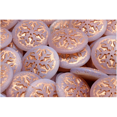 Jemný lila odstín připomínající ranní červánky na zasněžené louce definuje tento skleněný kabošon o průměru 21 mm. Každý kus nese precizně vylisovaný motiv vločky, který je zvýrazněn hřejivým měděným dekorem, dodávajícím šperku hloubku a luxusní nádech. Tato ruční výroba z dílny rodinné firmy Rutkovský v sobě nese staletou tradici českého sklářství, kde se kvalita potkává s uměleckým citem pro detail.